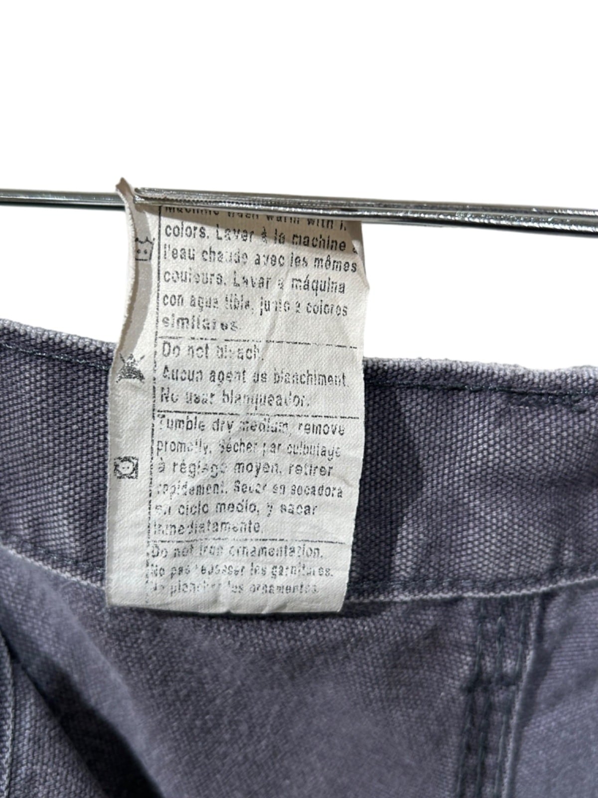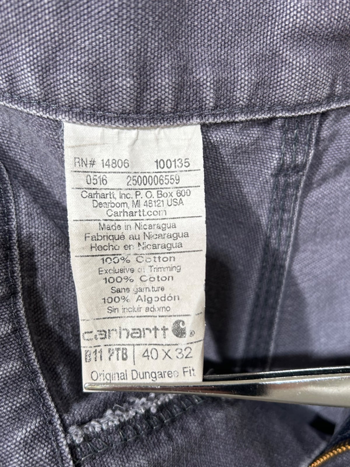 Carharttの定番ワークパンツラインの流れを汲む『Original Dungaree Fit』表記の個体。タグにMade in Nicaragua、RN#14806の記載があり、量産期のワークウェアとして現場で実用されるための仕様で作られています。ペインターパンツの機能性(ハンマーループ、ツールポケット類)を落とし込みつつ、ストリート寄りにも落とし込める仕上がりです(推定年代: 00s)。