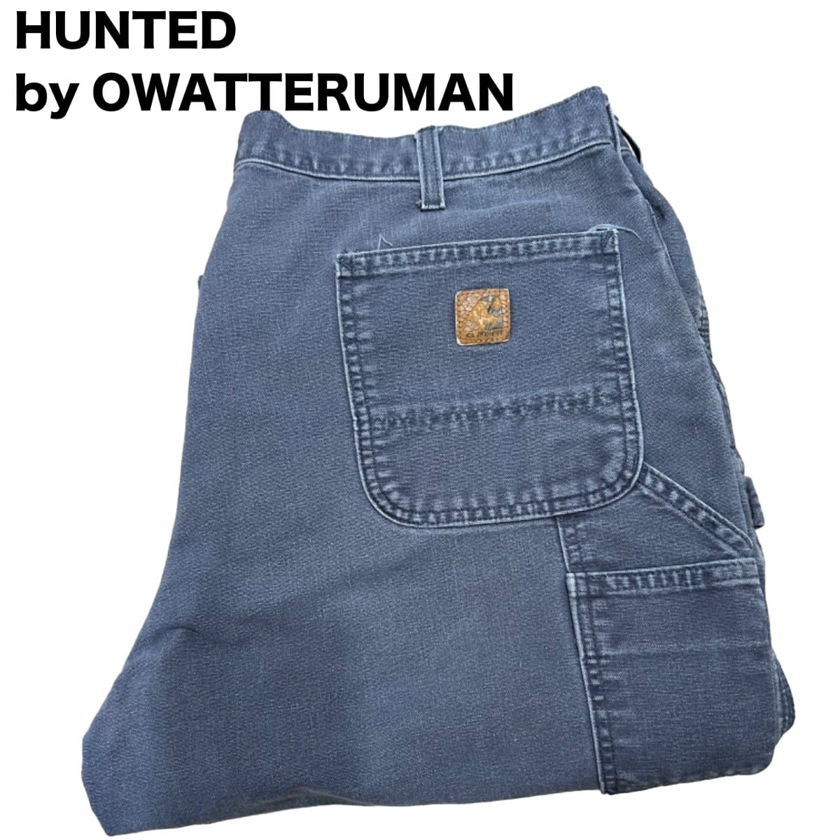 股上が深めでワタリにゆとりのある太めストレートシルエット。厚手のコットン生地(ダックに近いがタグは100%コットン表記)で耐久性が高く、ハンマーループや脇のツールポケットといったワークディテールを備えています。フロントはYKKらしきジッパー+刻印ボタン、バックポケットにレザーパッチが付く仕様で、穿き込むほどに色落ちやアタリが出て雰囲気が増すタイプ。膝やバックポケット付近にペンキ飛び・淡い色褪せがあり、ワーク感を強めるユーズドコンディションです。裾はストレートでロールアップしてもバランスが取りやすいシルエット。