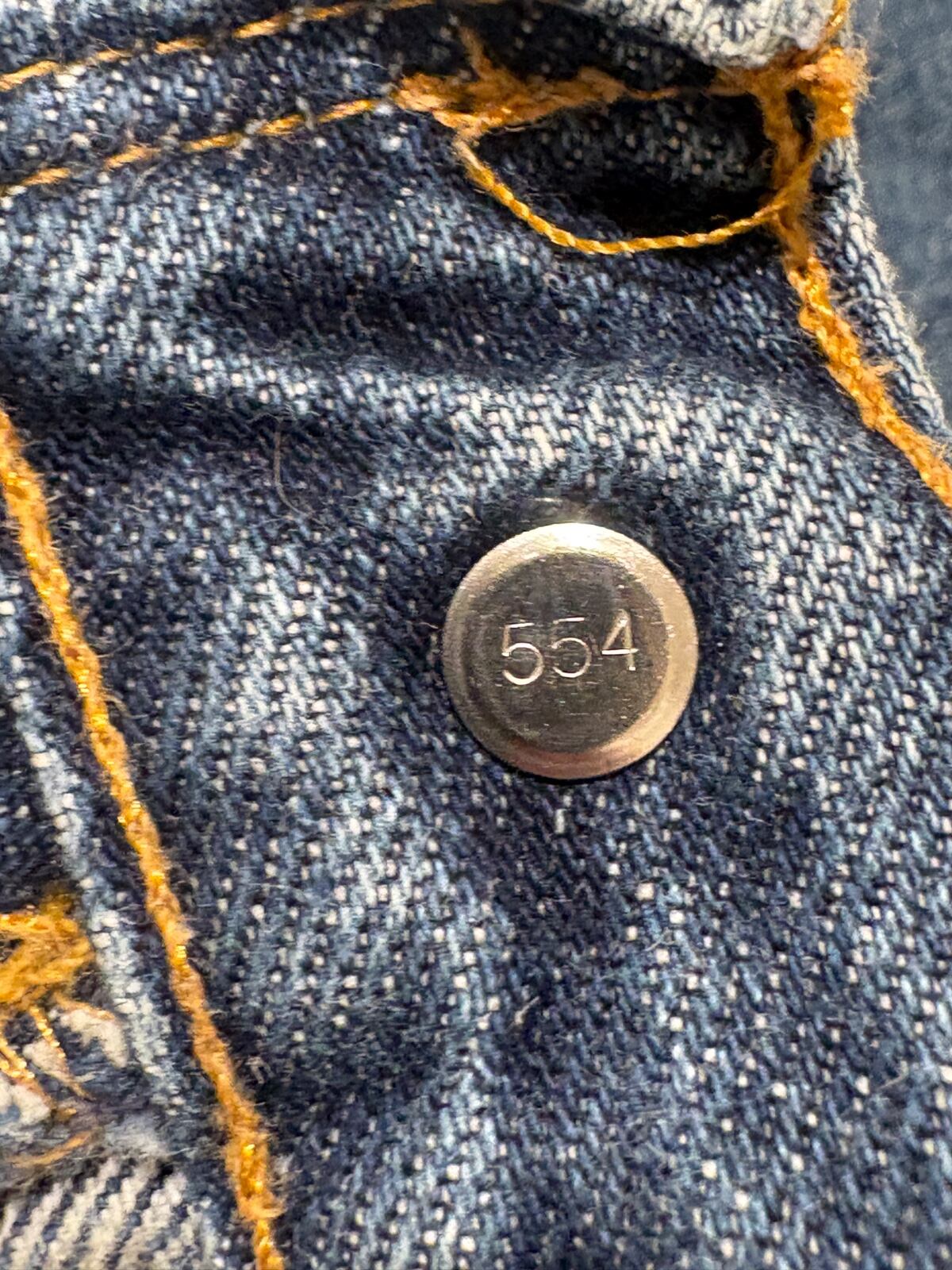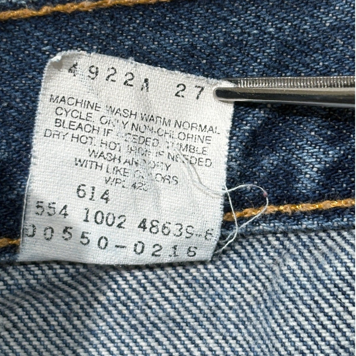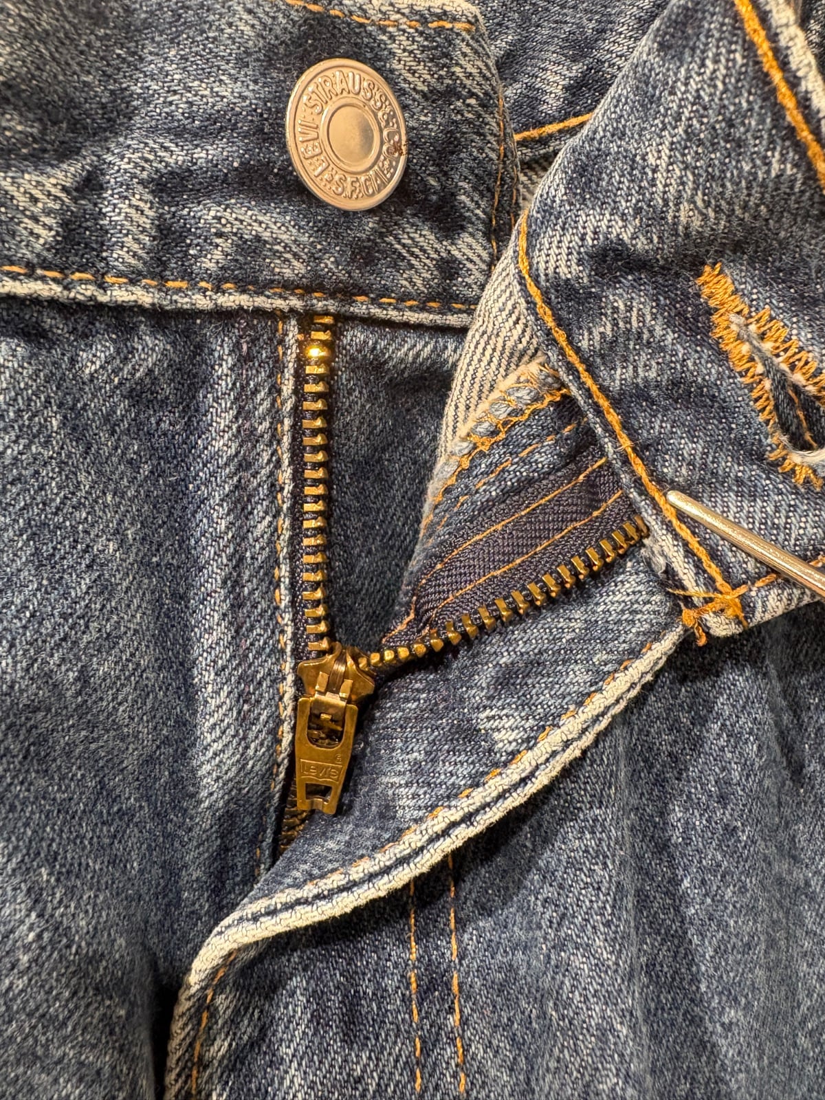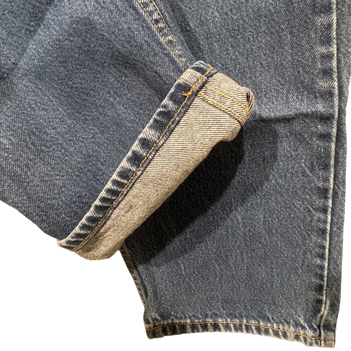 550はリラックスフィットとして90sに広く流通したモデルで、ゆったりとした腰周りと腿の余裕を持たせつつ裾でやや収まるシルエットが特徴。今回の個体はタグ表記に「550 RELAXED FIT」「100% COTTON」「MADE IN U.S.A.」の記載があり、YKK製の真鍮ジッパーや紙タグの仕様、リベット刻印などの仕様から90sと推定できるため、当時のワーク〜ストリート寄りの着こなしに素直に馴染む一本です。