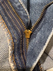 股上が深めでワタリにしっかり余裕がある典型的なリラックスフィットの造り。裾幅20cmと比較的細めに収まる設定なので、腰〜腿はゆったり、裾はやや絞られるバランスで現代のスタイリングにも合わせやすいです。生地はミドル〜ヘビーウェイトのコットンデニムで、膝周りや腿に自然な色落ちが見られるためカジュアルな着用感が出ています。フロントはYKKの真鍮ジッパー、トップボタンとリベット類も金属仕様で耐久性のある作りです。