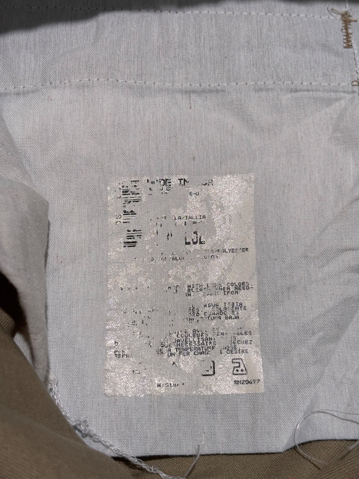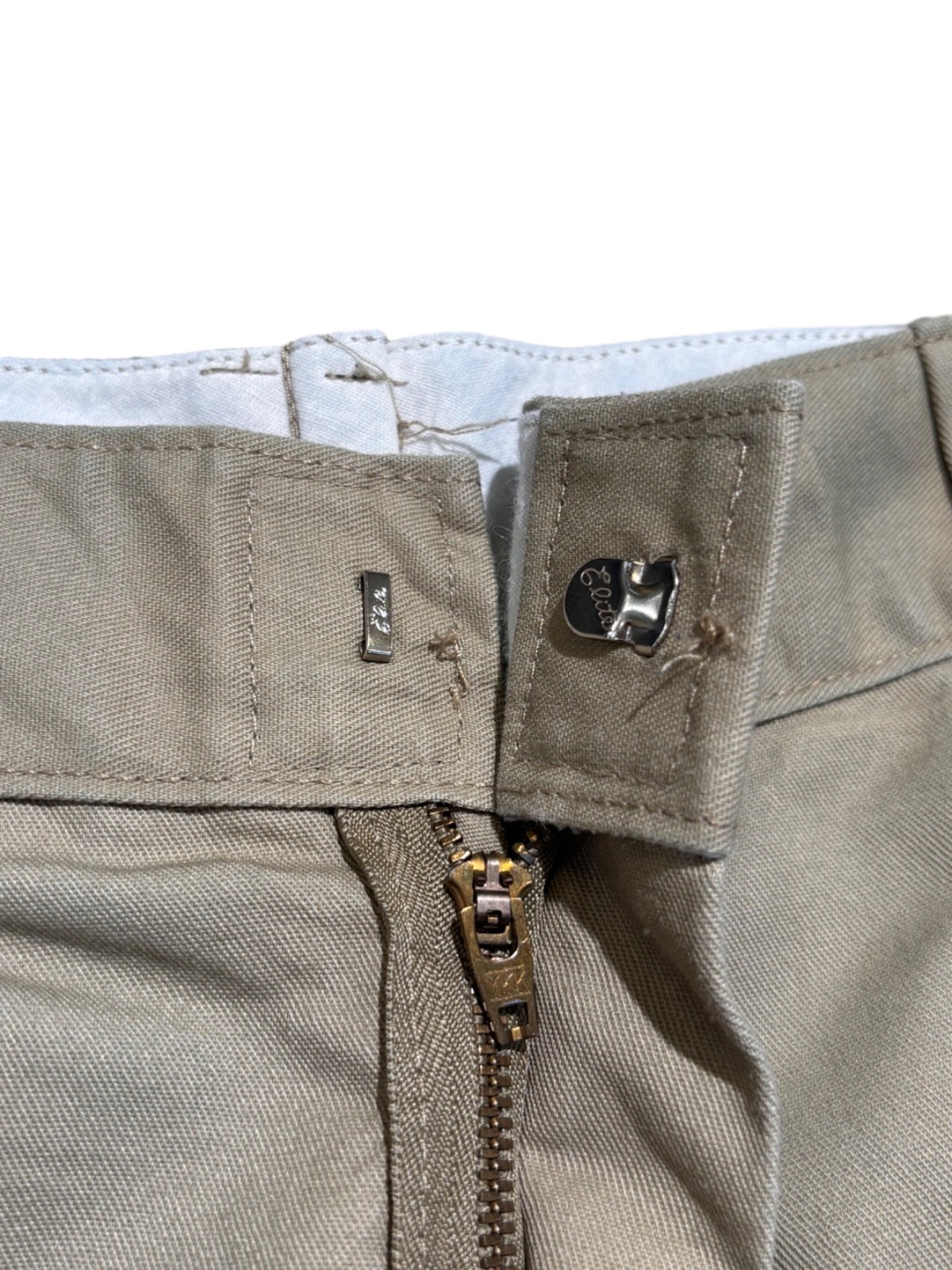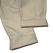 ダブルタックとやや短めのレングス感が効いたワーク寄りのチノパン。腰周りにゆとりを持たせつつ裾に向かって自然に細くなるテーパードシルエットは、ワークウェアとしての耐久性とタウンユースでの扱いやすさを両立させる設計だ。内側のプリントケアタグ仕様やバックポケット脇のブランドタグ等から、比較的近年(推定00s)の生産と思われる一着で、安定した縫製と日常的に使える見た目が特徴になっている。