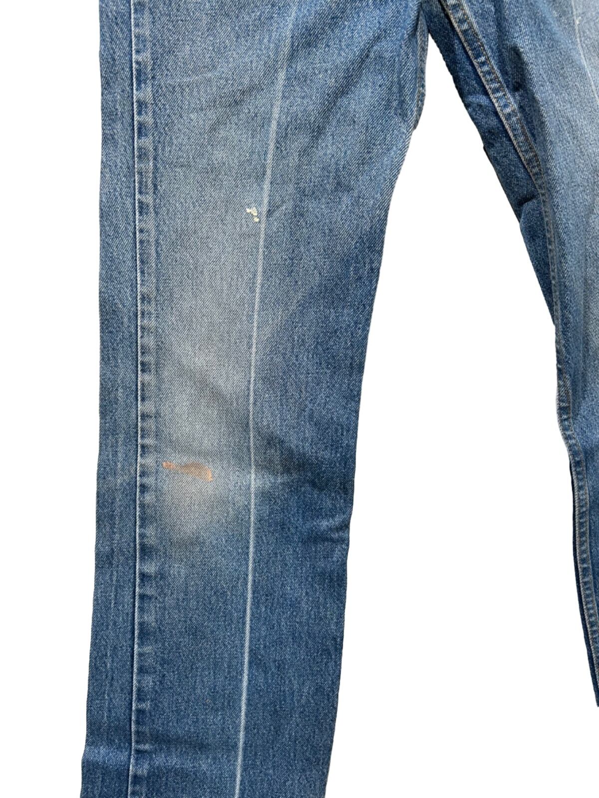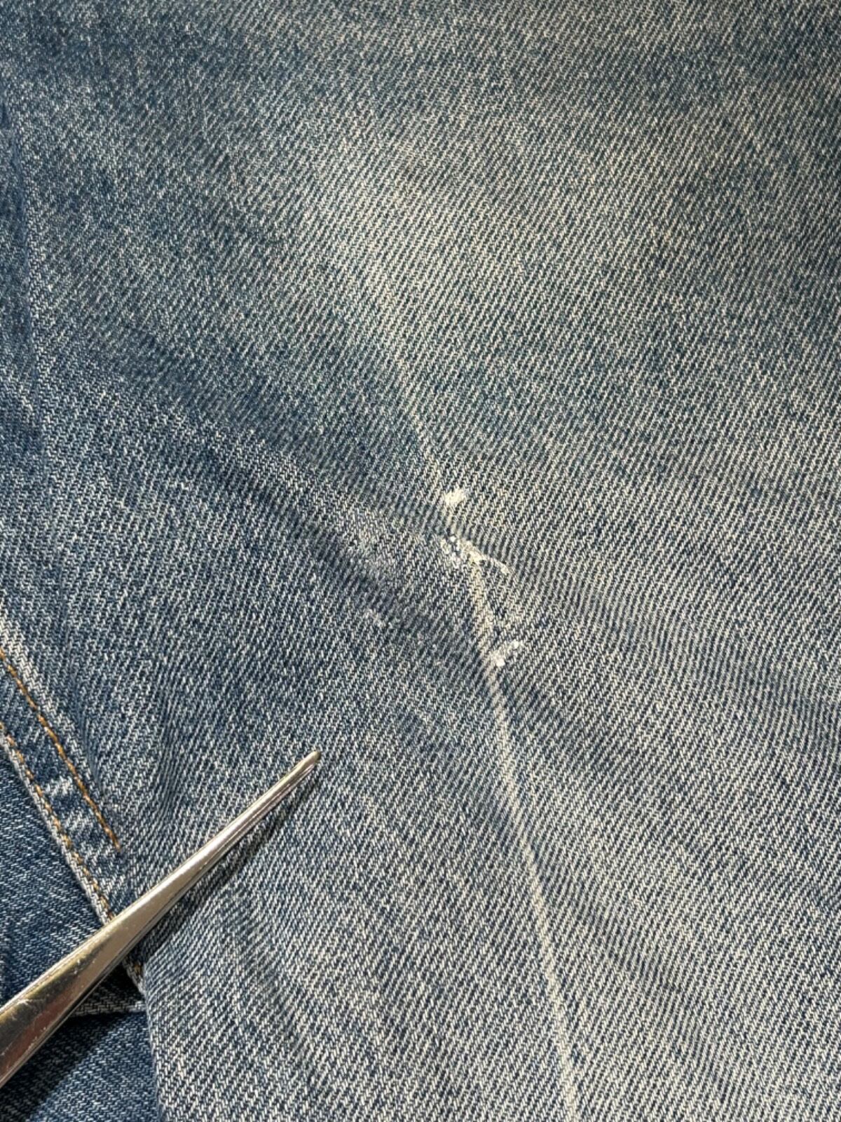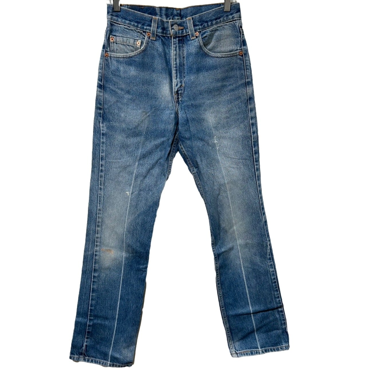 腿から膝にかけては程よくフィットし、膝下から裾にかけて少し広がるブーツカットのシルエット。生地はミドルオンスのコットンデニムで、全体に均一ではないフェード感とアタリが出ており、ポケット口周りや膝周辺、裾まわりに使用感が集中している。バックポケットには擦れと小さなダメージ、太腿部分にペンキ飛びや小穴が確認できるため、無加工でそのままカジュアルに穿ける雰囲気がある。フロントはジッパーフライ仕様で、レザーパッチの文字は経年で落ち着いた表情になっている。