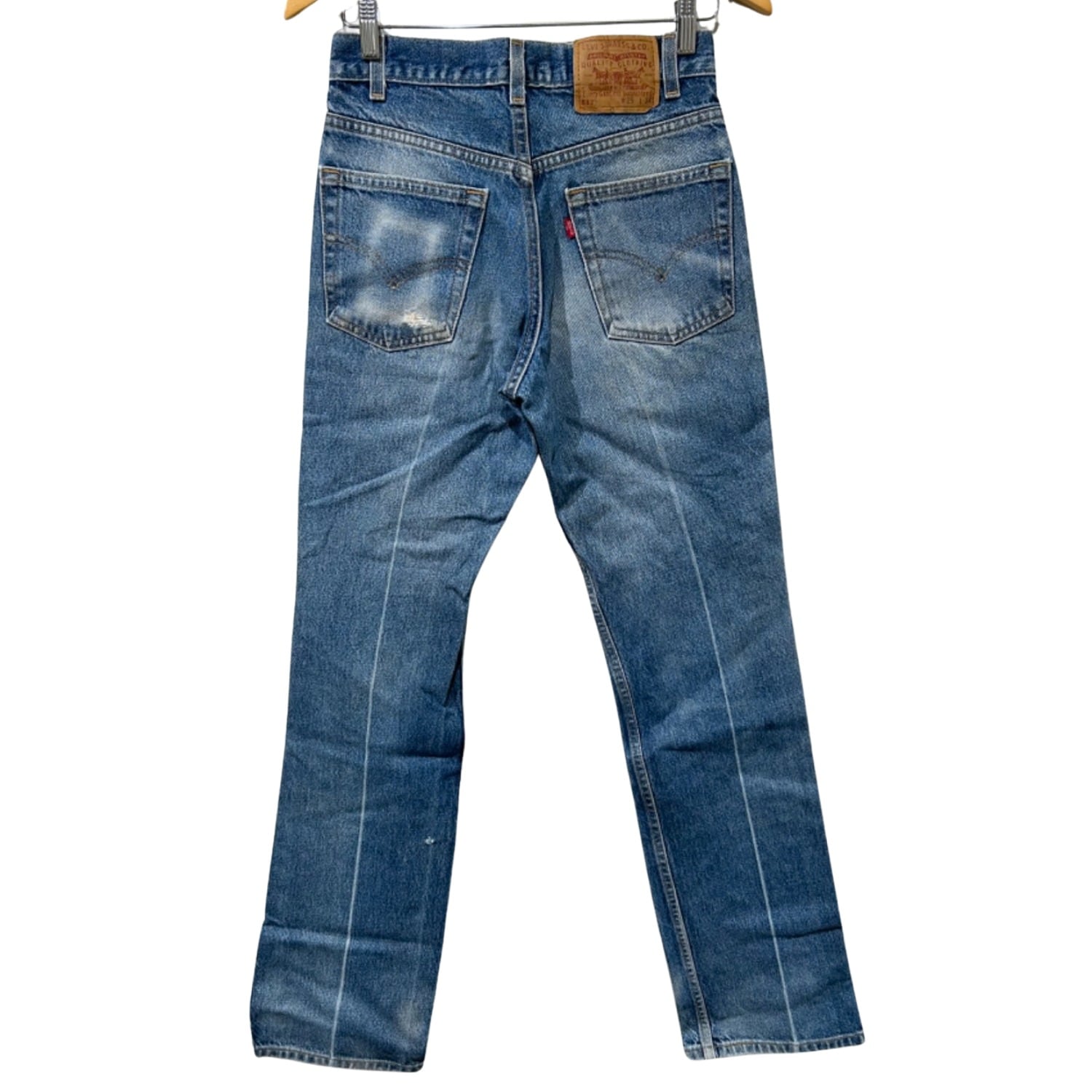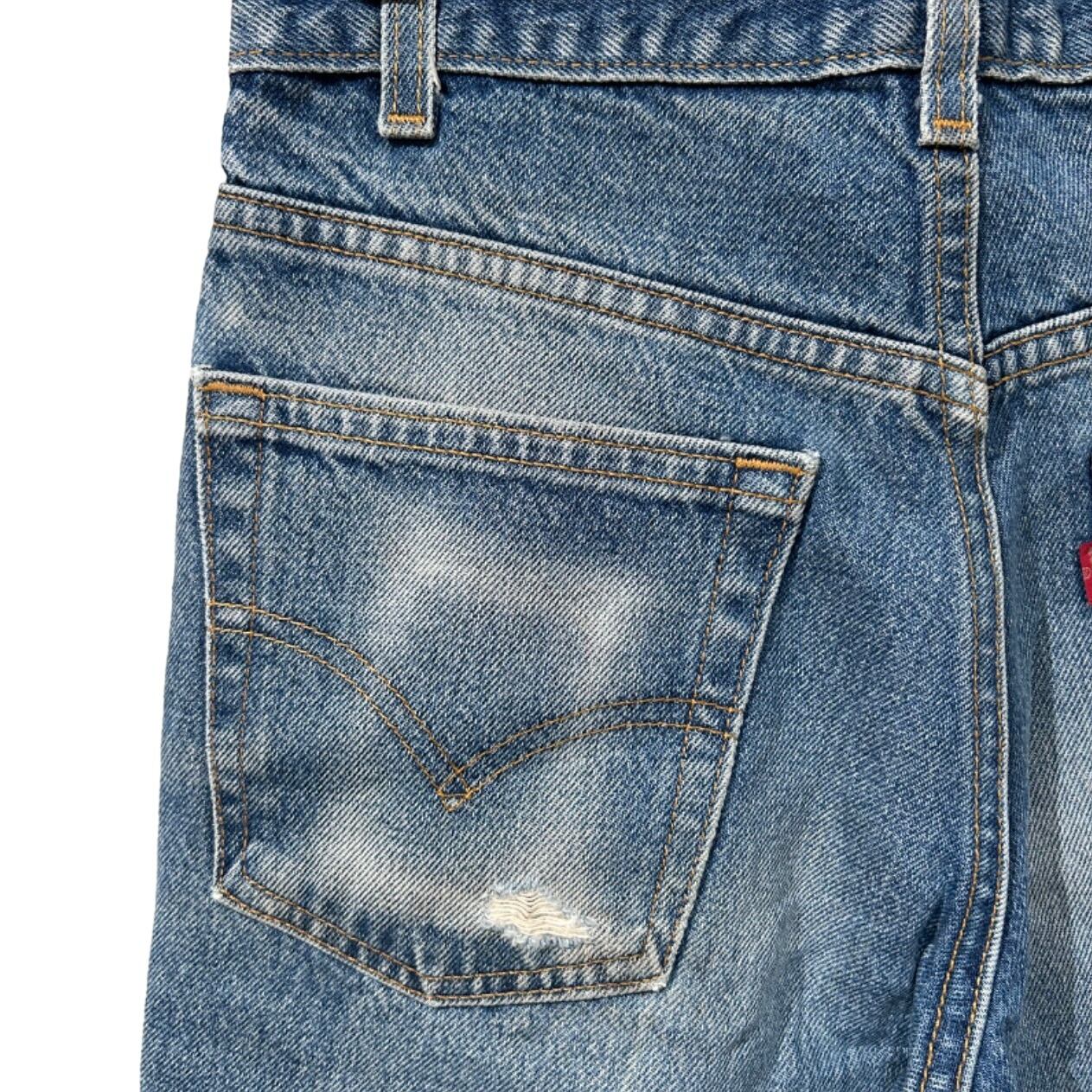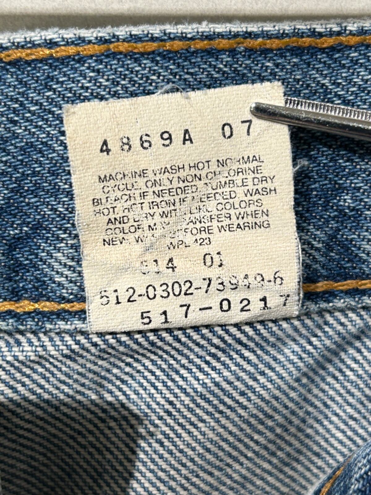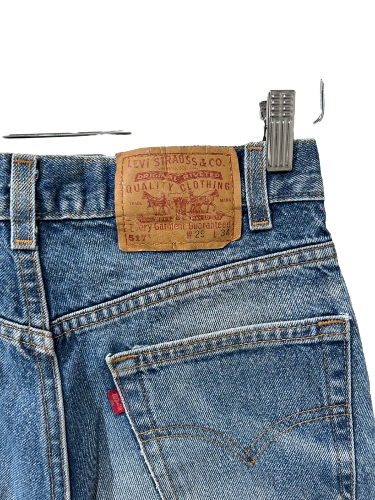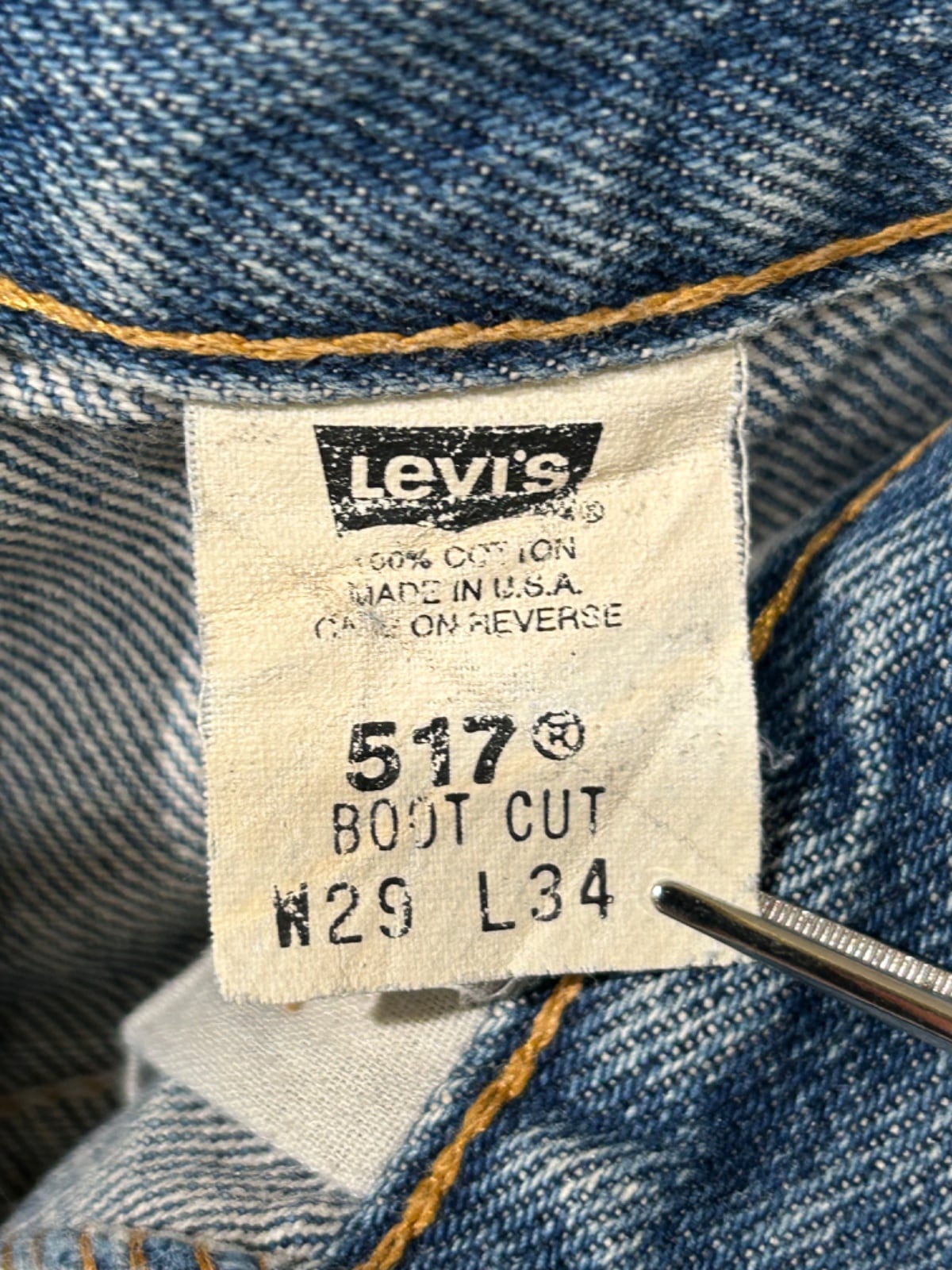 Levi'sの517はブーツカットとして90sに広く流通したモデルで、ワーク/カジュアルの間を行き来する用途が多い一本。今回の個体は内側タグの「517」「100% COTTON」「MADE IN U.S.A.」表記や紙タグの番号表記を根拠に、90sの生産と推定できる。ブーツと合わせるためのシルエット設計と、日常で穿き込まれた色落ち・ダメージが見える点がこのモデルの持ち味になっている。