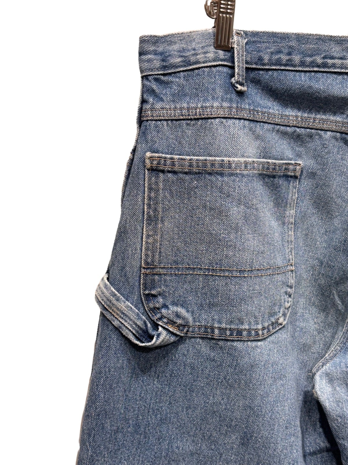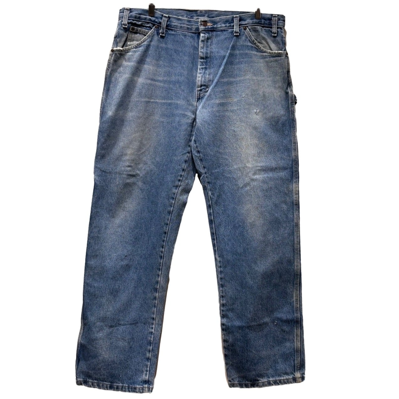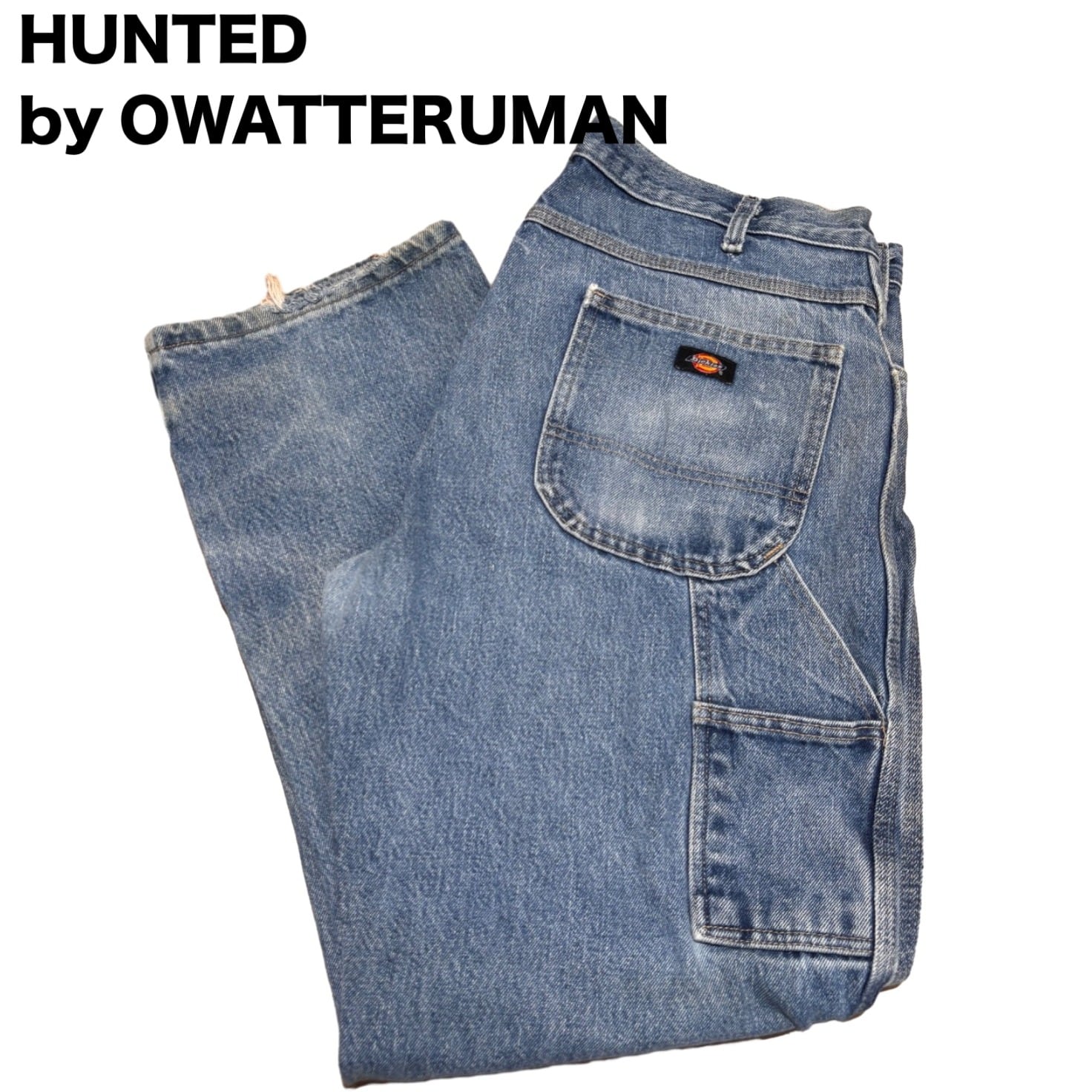腰周りに余裕を残したリラックスシルエットで、股上も深めの作り。サイドに設けられたペインターポケットとハンマーループがワークパンツらしい実用性を強調しており、バックポケットは丸みのあるパッチポケット仕様で容量が取りやすい作りです。生地は程よい厚みのデニムで、膝周りや腿に自然な色落ちとアタリが出ており、着古されたワーク感が出ています。金属ボタンにブランド刻印、ポケット上の小さなブランドタグなど、ディテールは明確です。裾にダメージとリペア痕、股下付近に小穴がありますので、ユーズドコンディションとしてご理解ください。