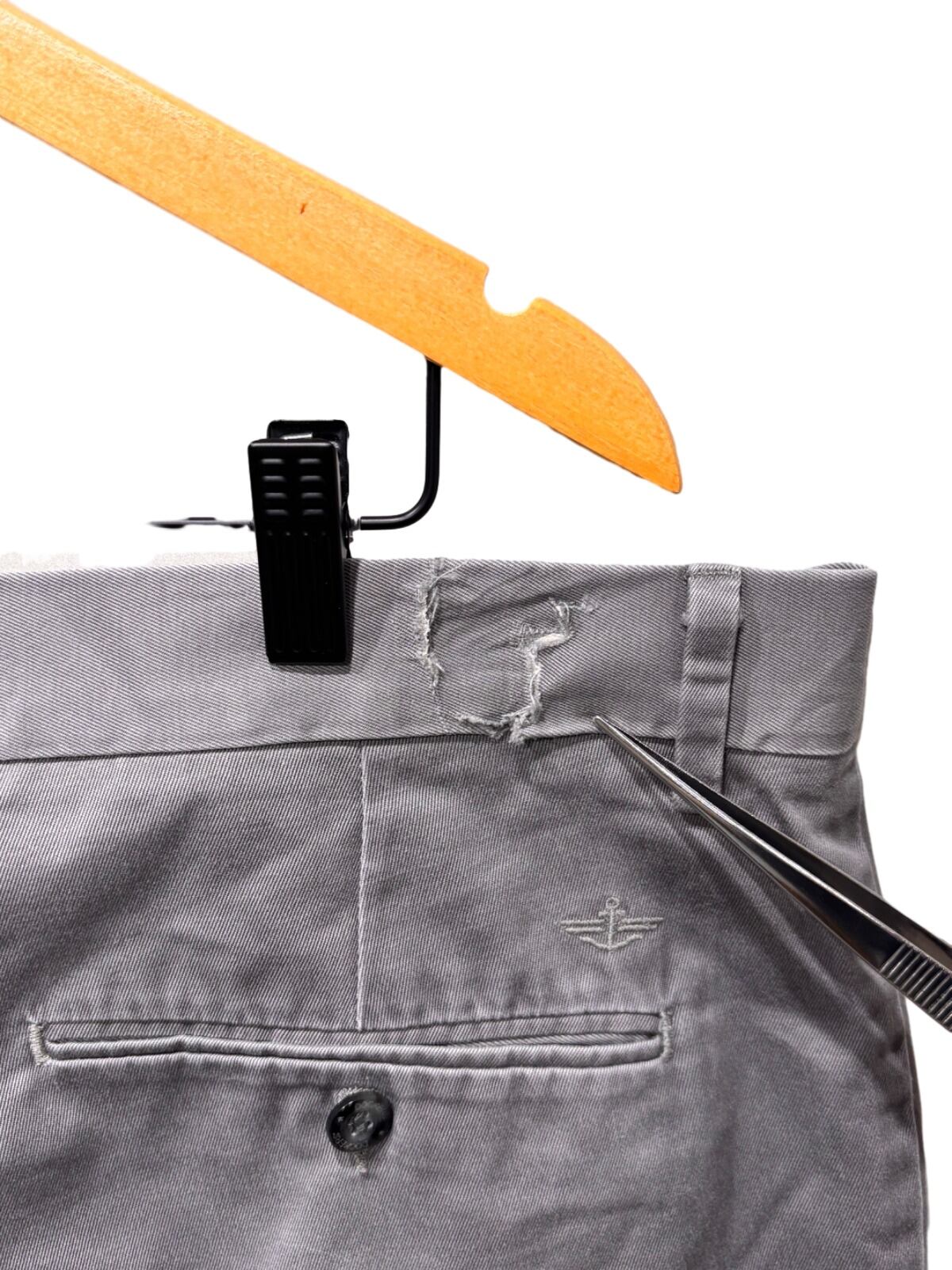 後ろにダブルウェルトポケット(右のみボタン留め)と腰上に小さなアンカーロゴ刺繍を備えた、汎用性の高いクラシックフィットのチノ。腿周りにゆとりがありワタリが広めなのでリラックスした穿き心地。膝から裾にかけては比較的まっすぐ落ちるストレート寄りのシルエットで、ロールアップしても収まりが良い設計。裾は折り返しでもそのままでも使える厚み。ウエスト周りのベルトループ付近にほつれがあり(写真で確認できるダメージ)補修を推奨する状態。