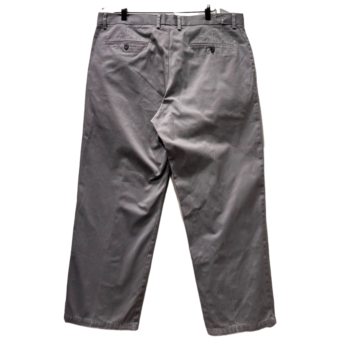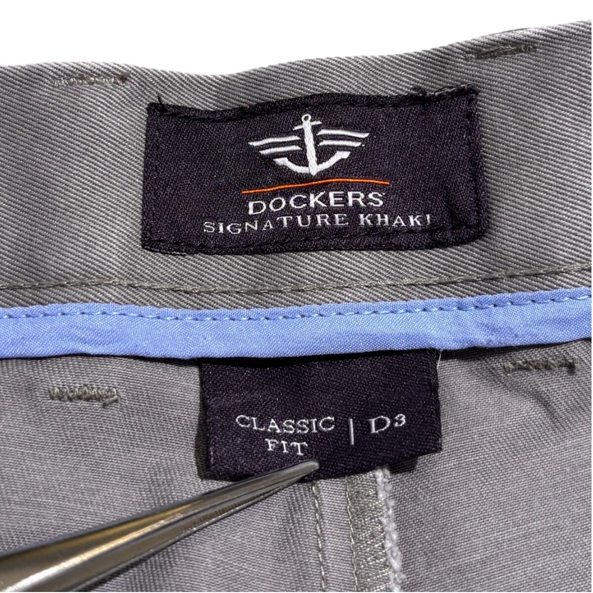 DockersのSignature Khakiはビジネスカジュアルからワーク寄りの普段着まで幅広く受け入れられてきた定番ライン。今回の個体は内側ラベルの「DOCKERS SIGNATURE KHAKI」と「CLASSIC FIT | D3」という表記、シンプルなポケット構成やボタン仕様といった構成から、量産期のチノとして作られたことが読み取れる。そうした定番ラインのチノは、職場着から週末のカジュアルまで日常的に穿かれ、着倒されることで独特の落ち感と表情を纏っていく文化的経緯を持つ。