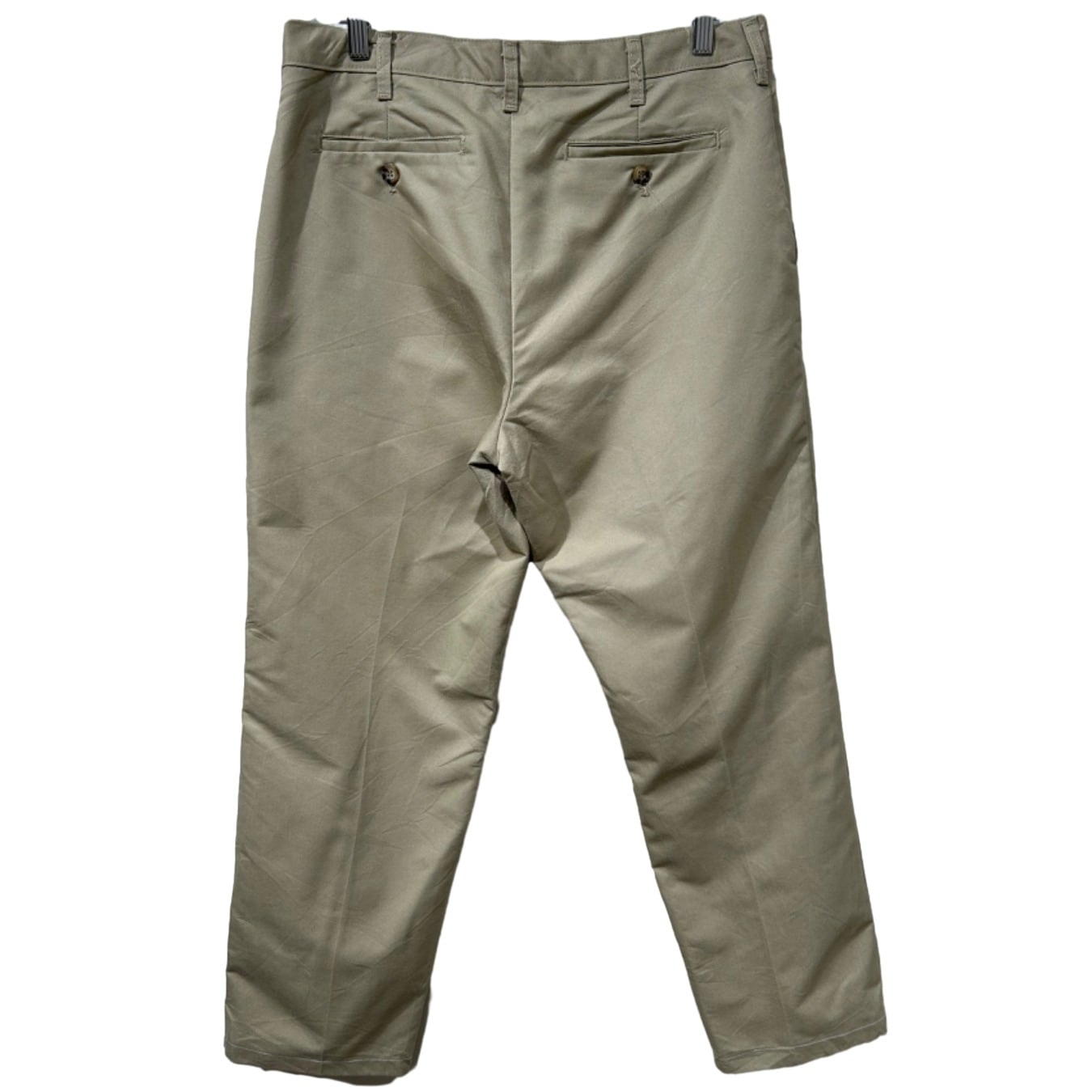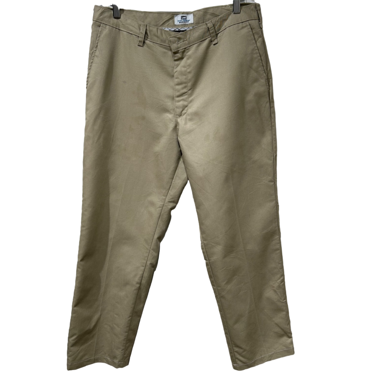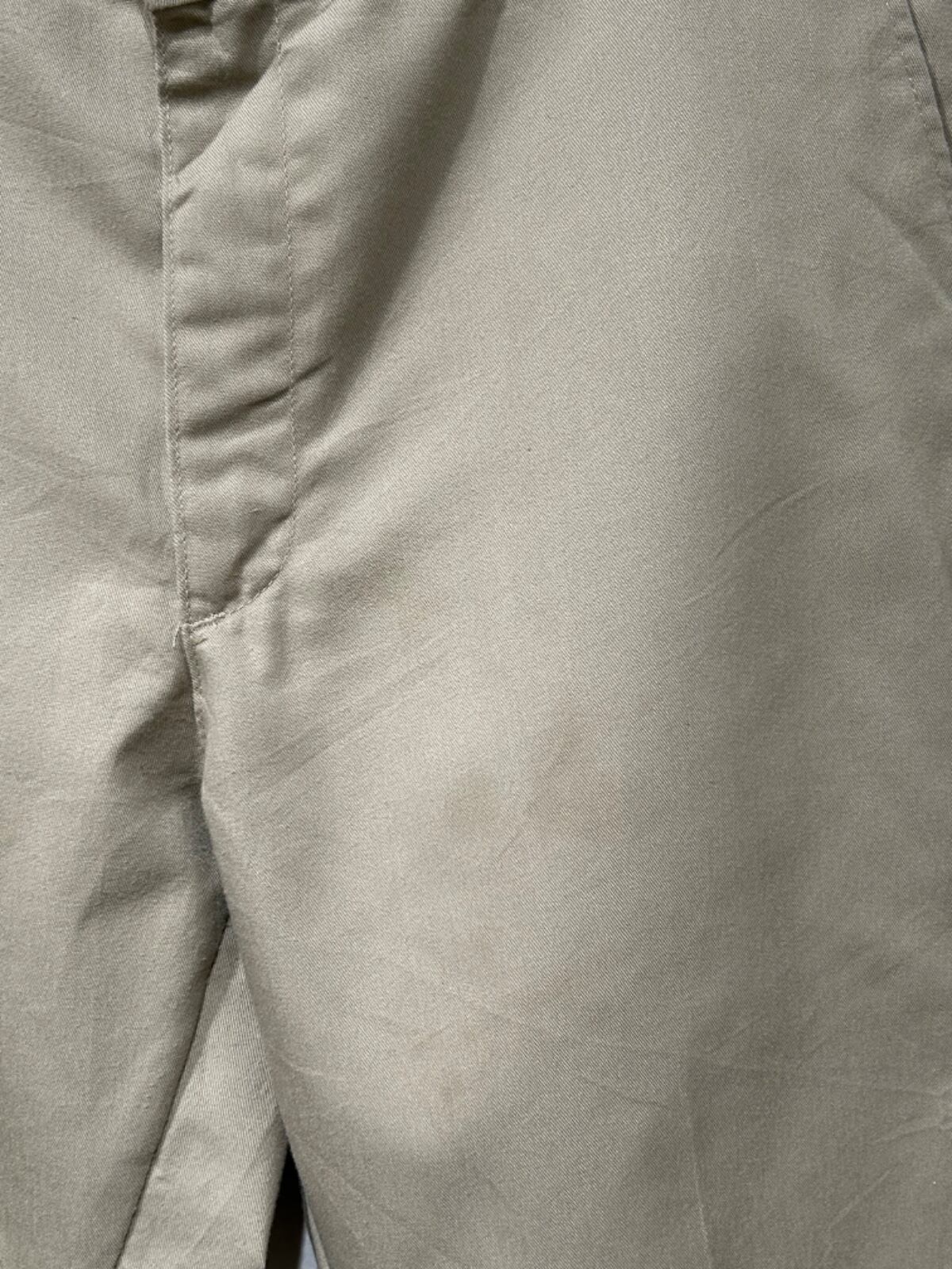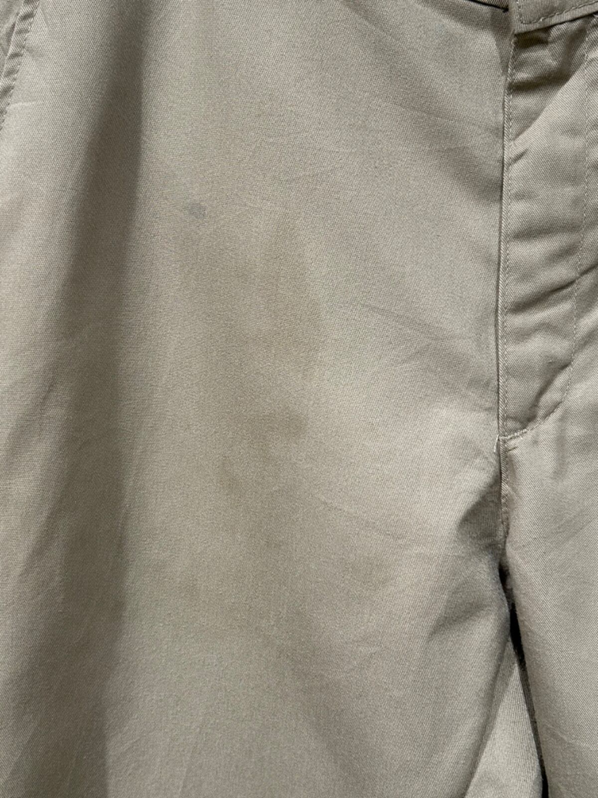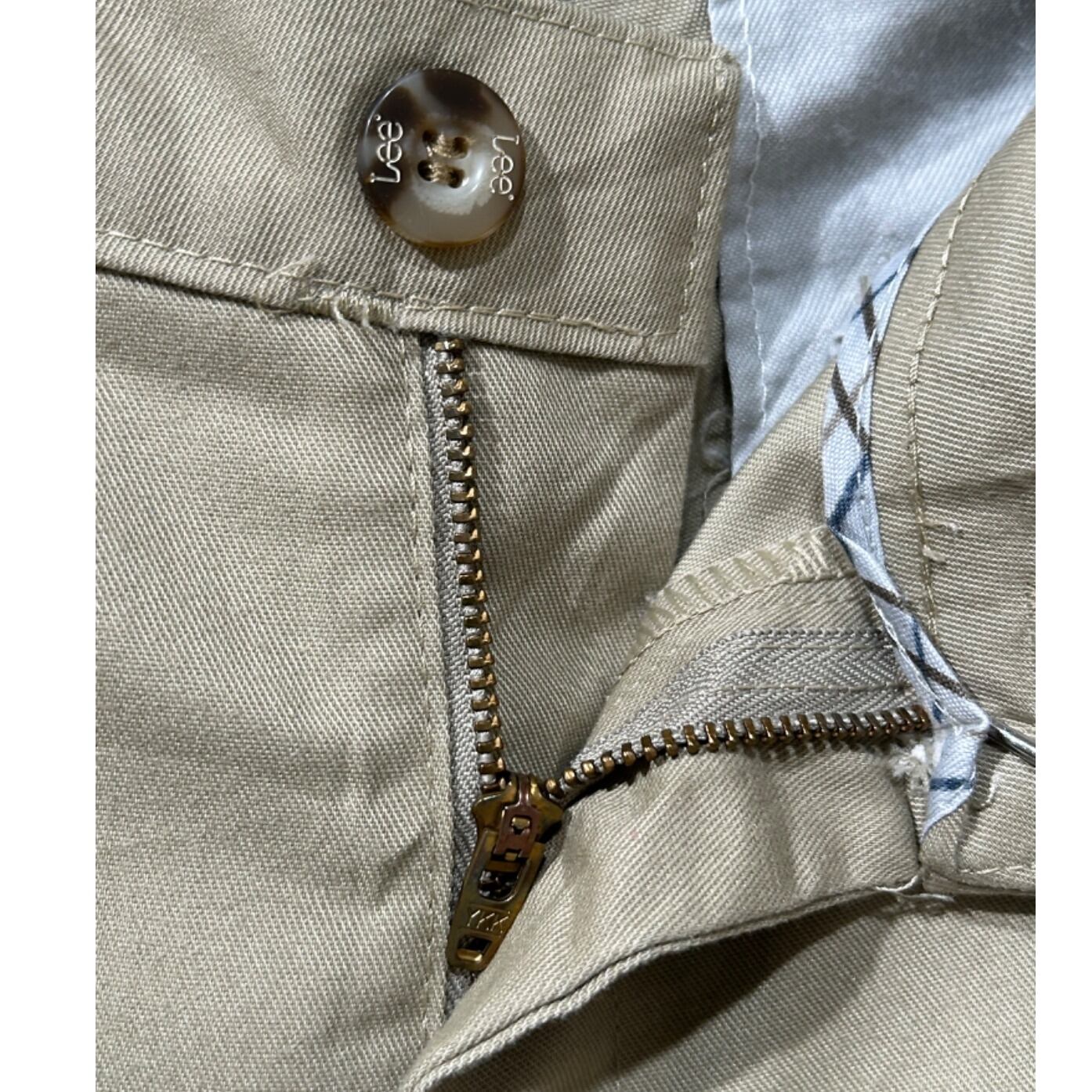 リラックスフィットを謳うだけあって腰回り〜ワタリにゆとりのあるストレート寄りのシルエット。ジッパーフライ、Lee刻印のボタン、ベルトループ、バックは両玉縁ポケットにボタン付きの定番ディテール。生地は薄手〜中肉のチノクロス系で程よくハリがあり、馴染むと自然なアタリが出るタイプです。使用感があり、太ももや股下付近に薄いシミ・色ムラが見られるため、完品を求める方よりも日常使いで味を出したい方に向いています。
