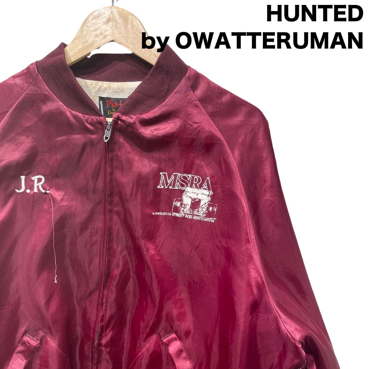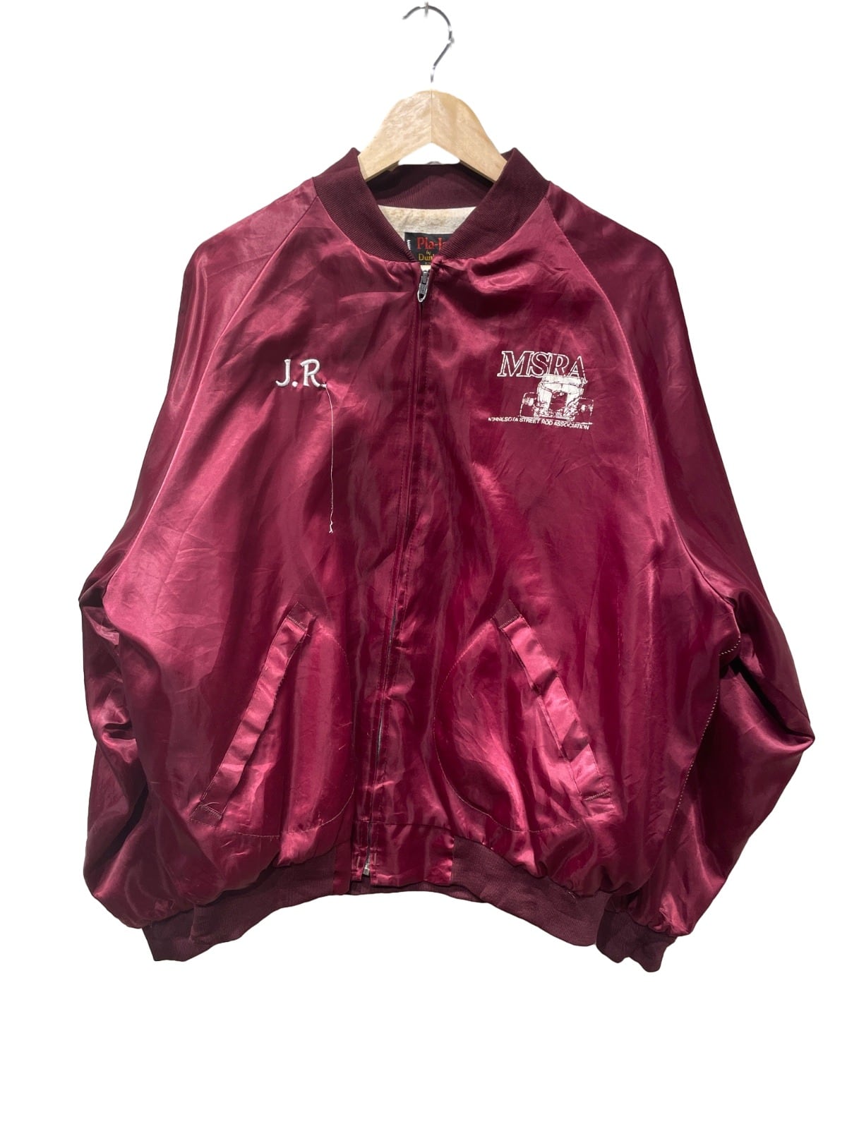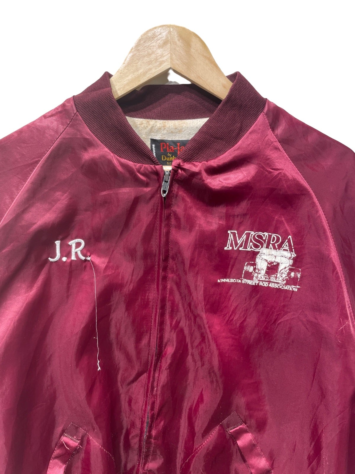 MSRA(Minnesota Street Rod Association)の大判刺繍を背面に配した、クラブ/イベント用のスタジアムタイプジャケットの系譜に当たる一着。襟下のPla-Jac by DunbrookeタグとMade in USA表記、金属引き手のジッパー形状から、アメリカ製のスポーツ/イベント配布物として作られた個体であると推定される。刺繍とイニシャル(J.R.)入りの仕様は、チームやクラブ単位で制作されたユニフォーム的な使われ方を想像させる。