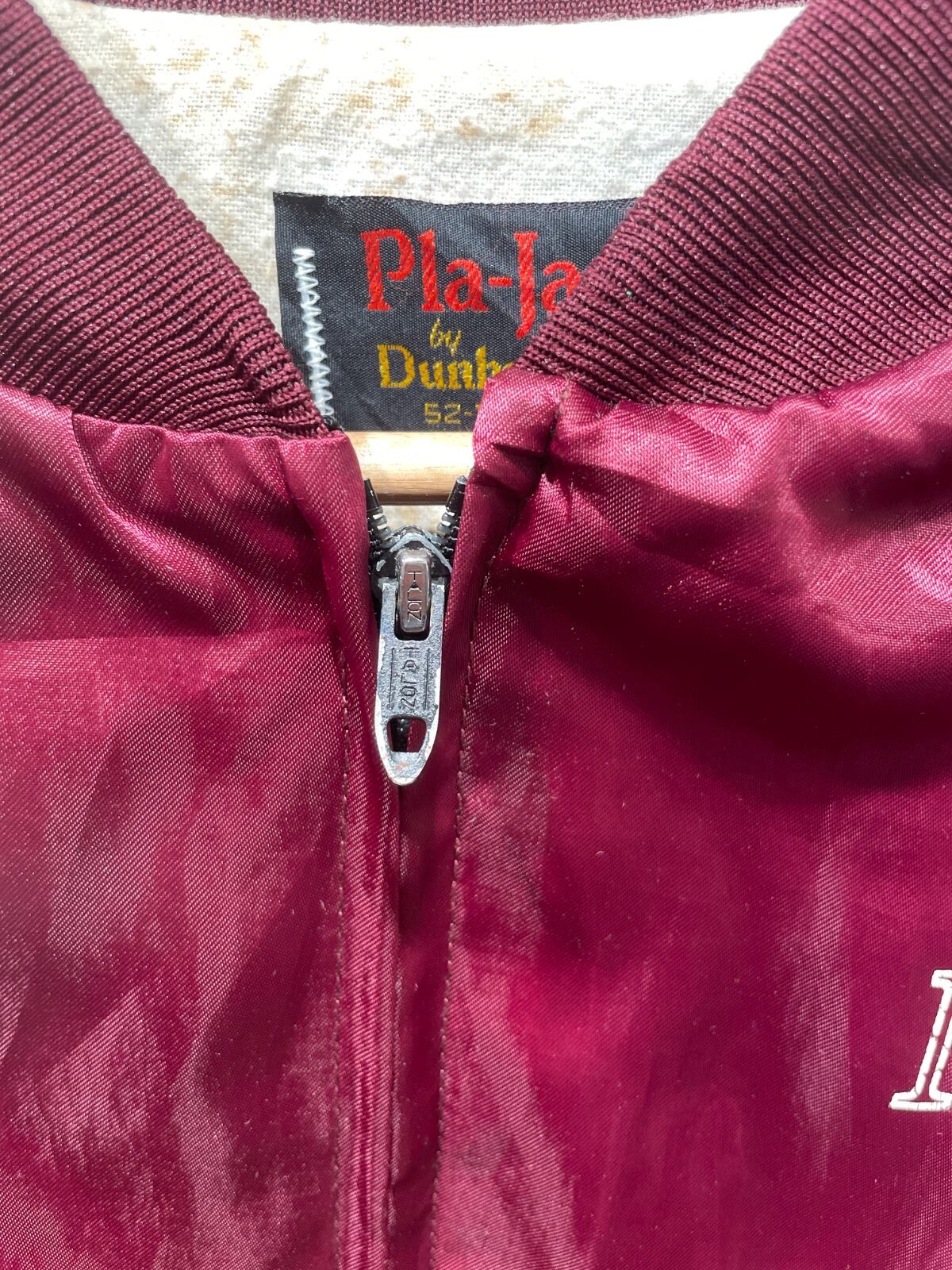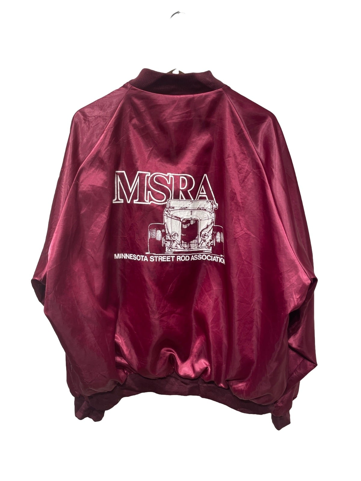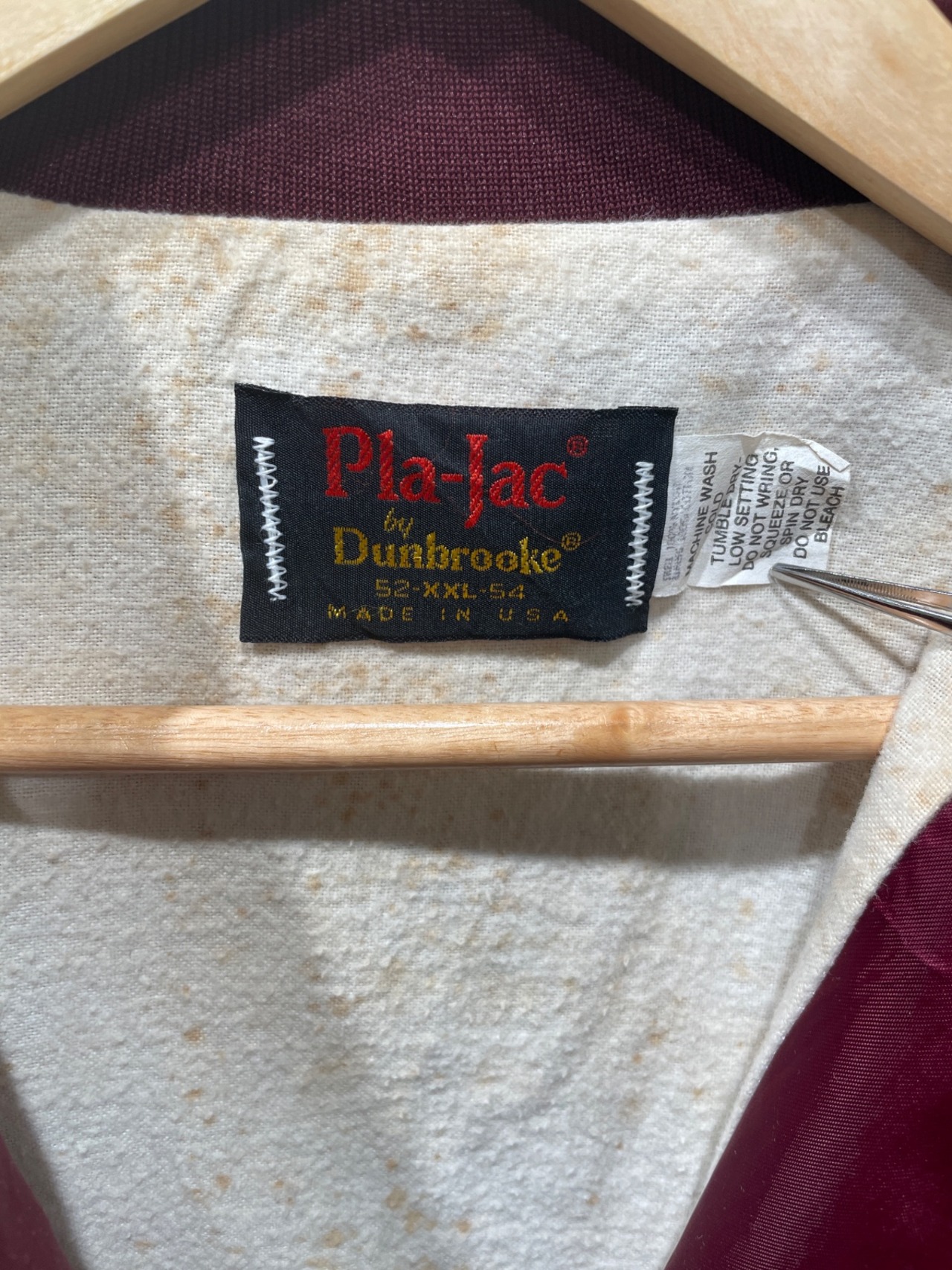 MSRA(Minnesota Street Rod Association)の大判刺繍を背面に配した、クラブ/イベント用のスタジアムタイプジャケットの系譜に当たる一着。襟下のPla-Jac by DunbrookeタグとMade in USA表記、金属引き手のジッパー形状から、アメリカ製のスポーツ/イベント配布物として作られた個体であると推定される。刺繍とイニシャル(J.R.)入りの仕様は、チームやクラブ単位で制作されたユニフォーム的な使われ方を想像させる。