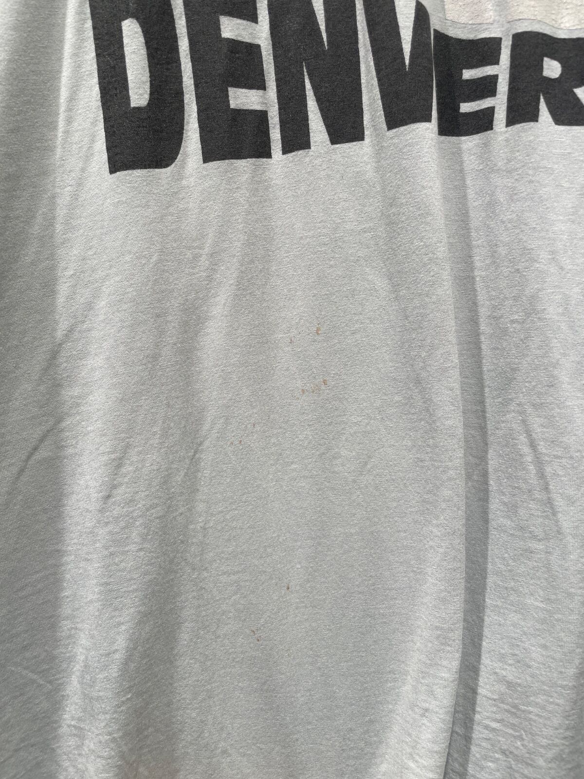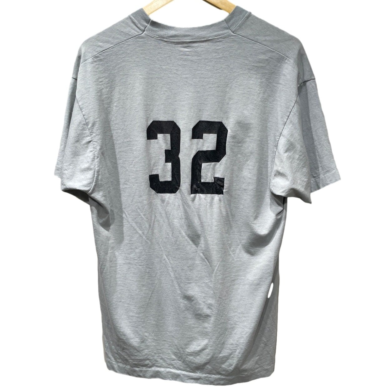 肩幅53cm/身幅53.5cmでややボックス寄りのシルエット。着丈は73cmとバランス良く、ゆったりとした着用感に寄せられる作り。生地は薄手で柔らかくドレープしやすい印象。フロントの大判ロゴが主役で、背面ナンバーがスポーティなアクセントになるため、1枚で着てもレイヤードでも映える。前身頃に点状の茶色いシミが複数確認できるため、状態重視の方はご注意を。
