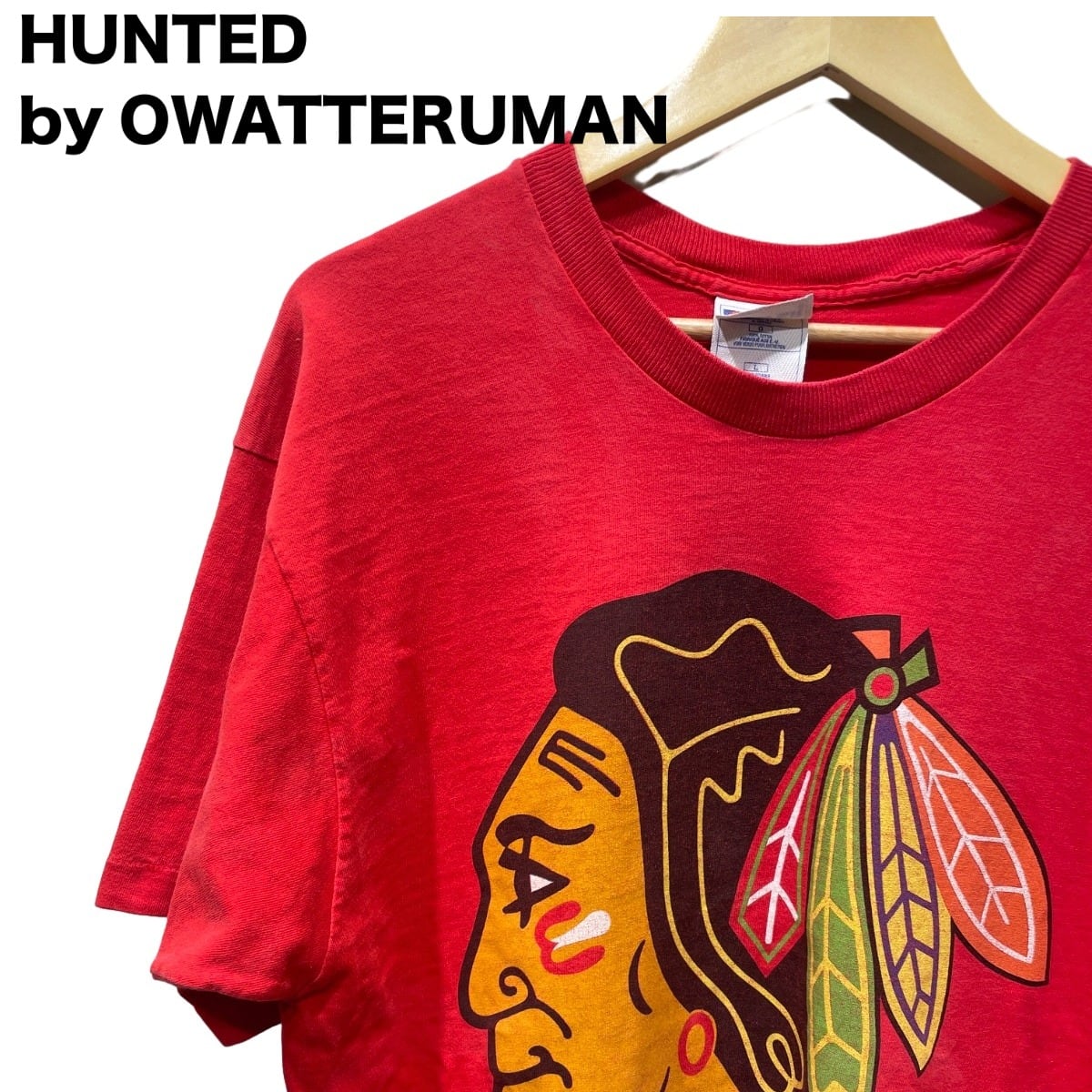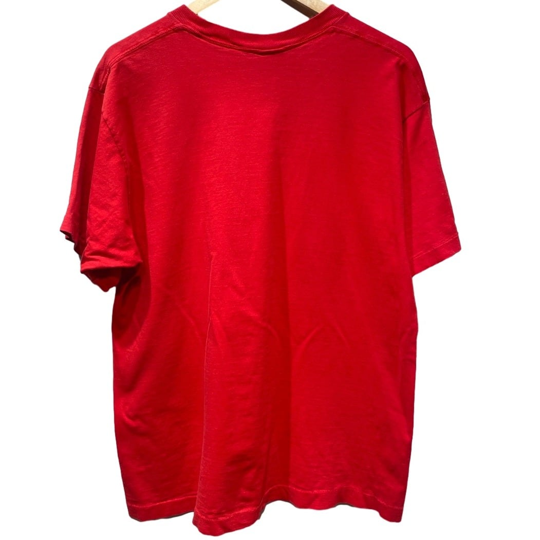 コットンボディはしっかり感があり、厚すぎないが存在感のある生地質感。胸中央に大きく入るフェイスモチーフが主役になるデザインで、単体で着るだけでコーディネートが決まりやすい。首リブは目立った伸びは少なく状態良好。裾付近に小さなホールが1箇所あり、全体に使用感と淡い色褪せが見られるため古着としての味が出ている。