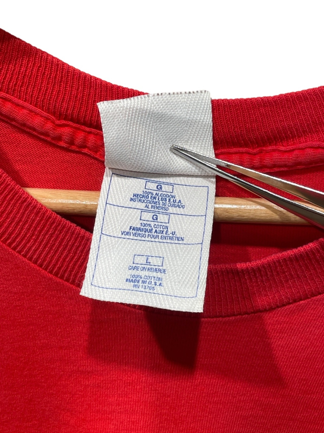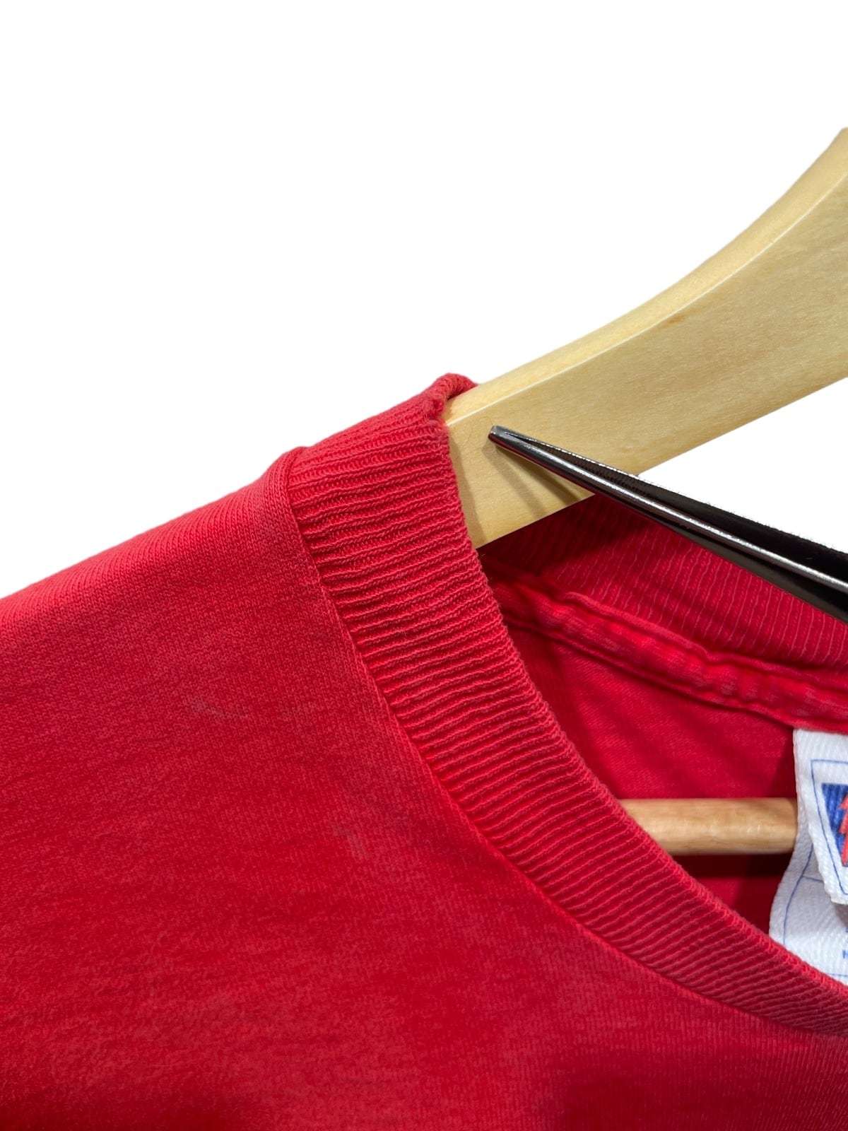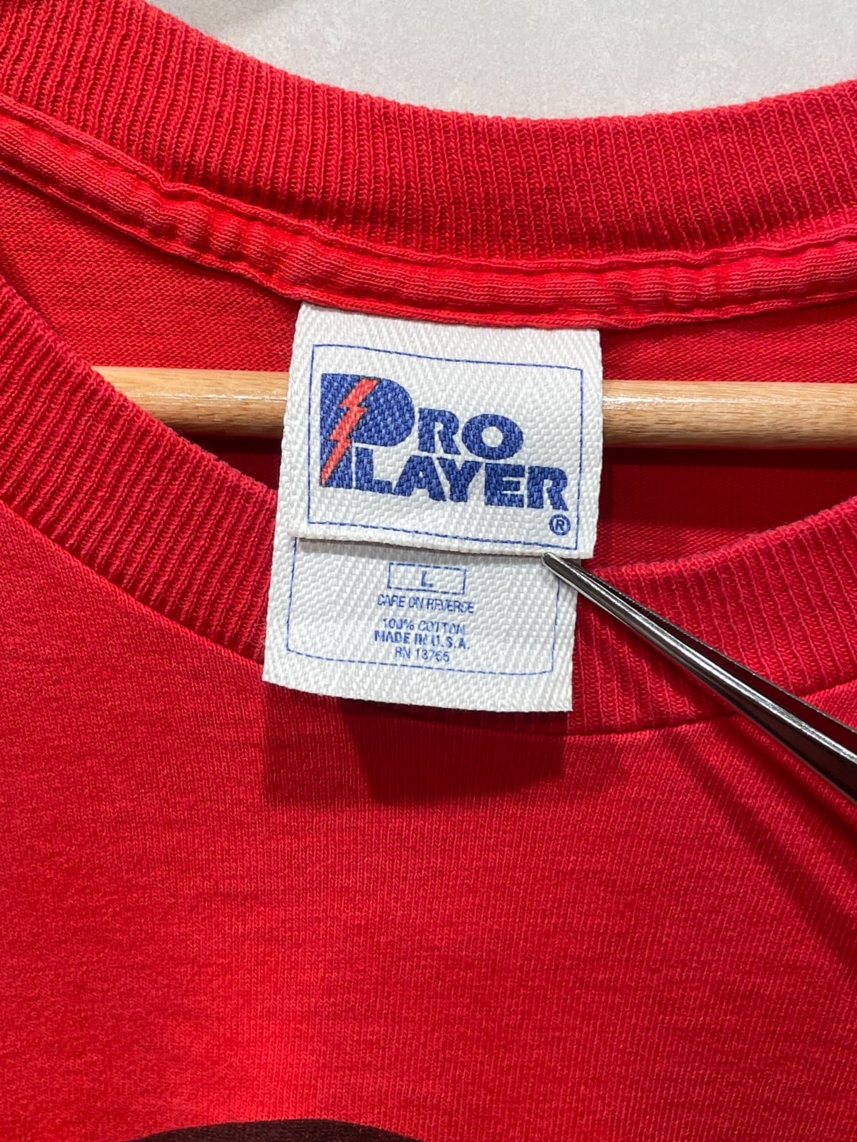 Pro Playerの織ネームと"MADE IN U.S.A."、100% COTTON表記から、この個体は90sのスポーツライセンス系Tシャツの流れにあると推定される。