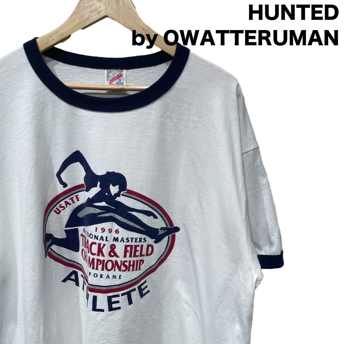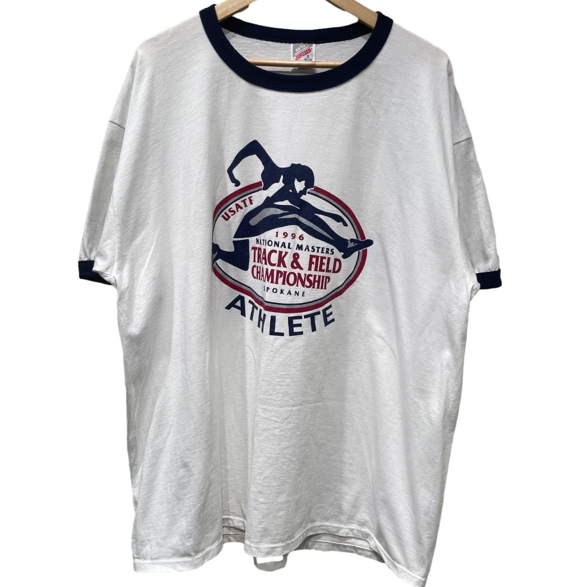 フロントに大きく入った“1996 National Masters Track & Field Championship”のプリントと“ATHLETE”表記が示す通り、競技イベントの参加または記念配布向けで、スポーツカルチャー寄りのストリートミックスに使える一枚。