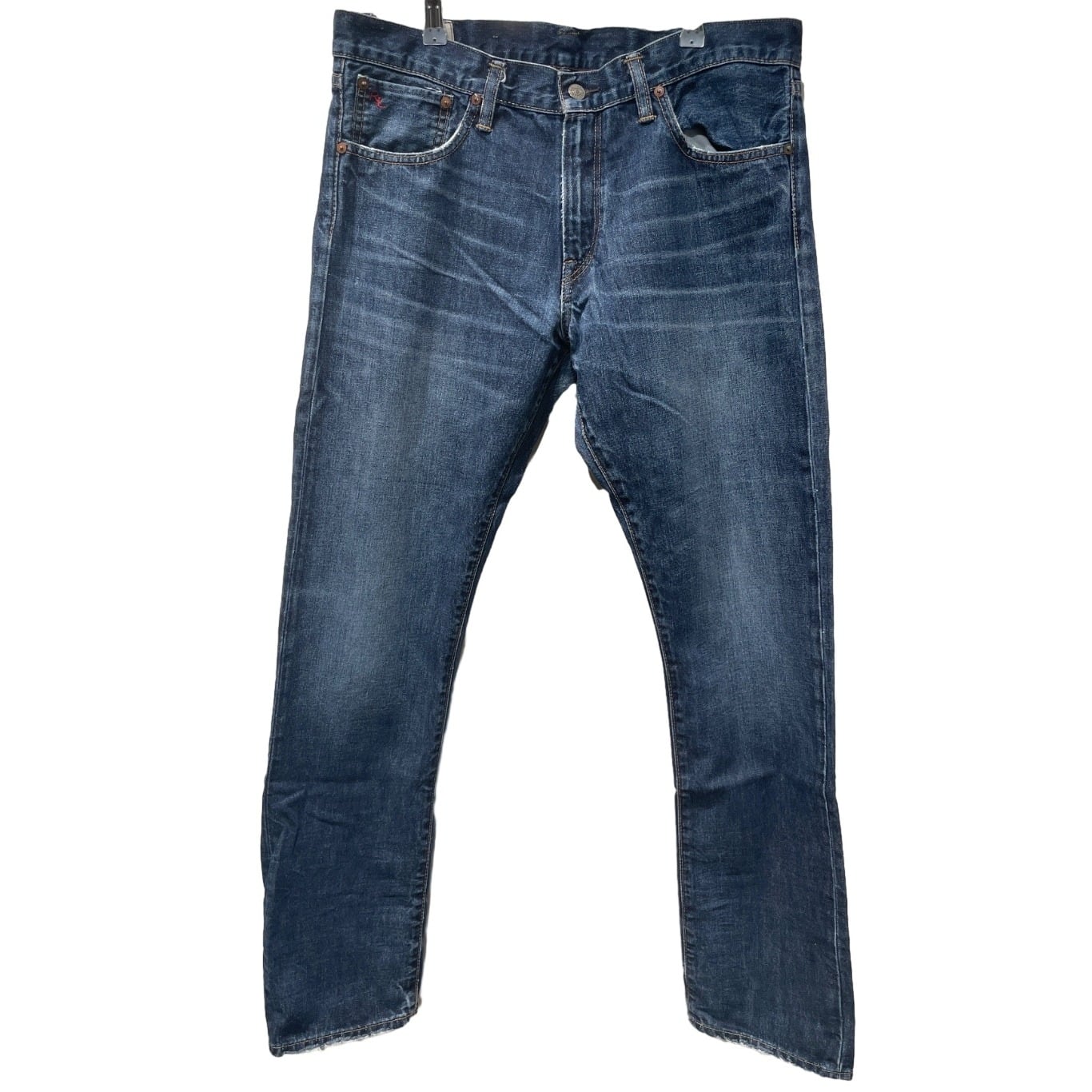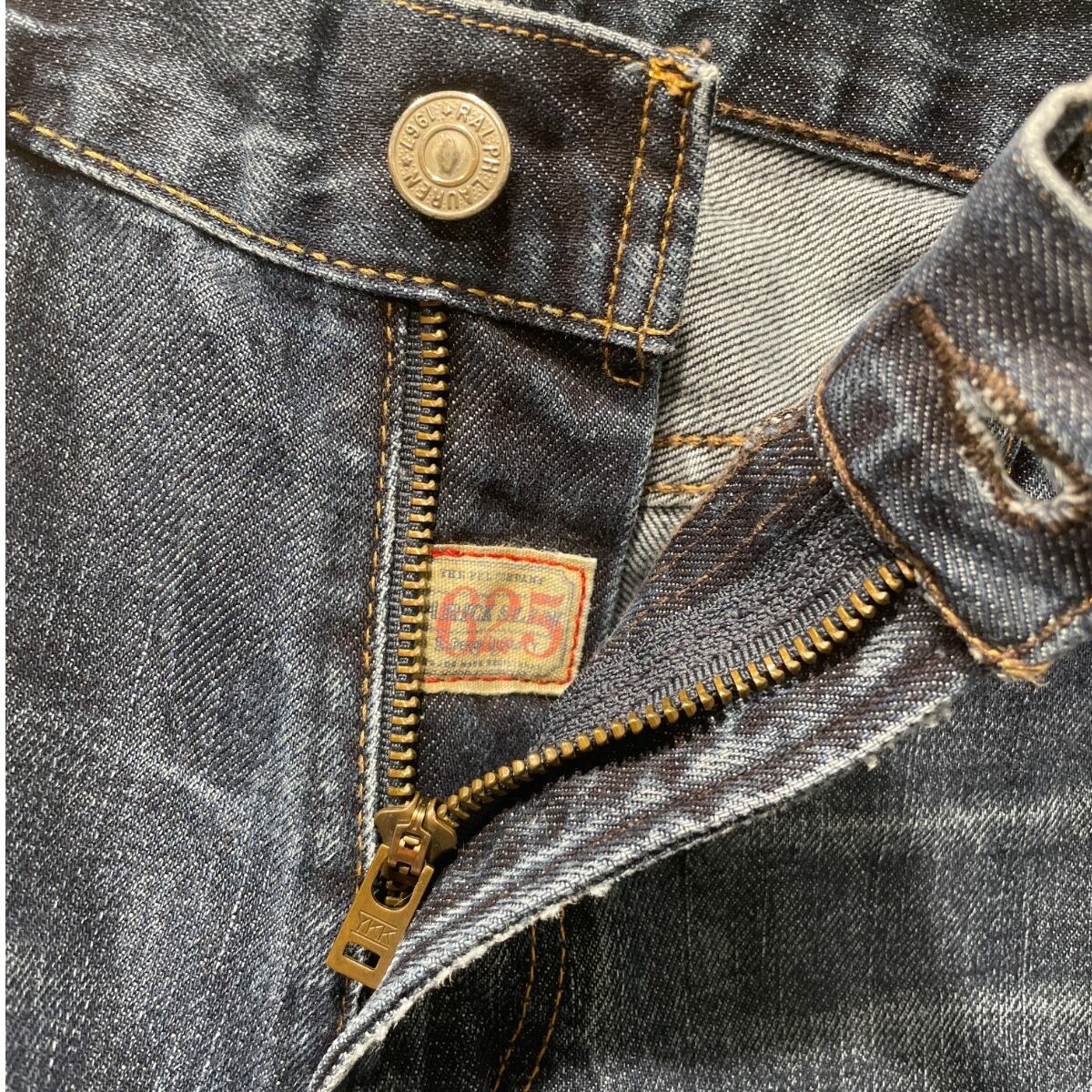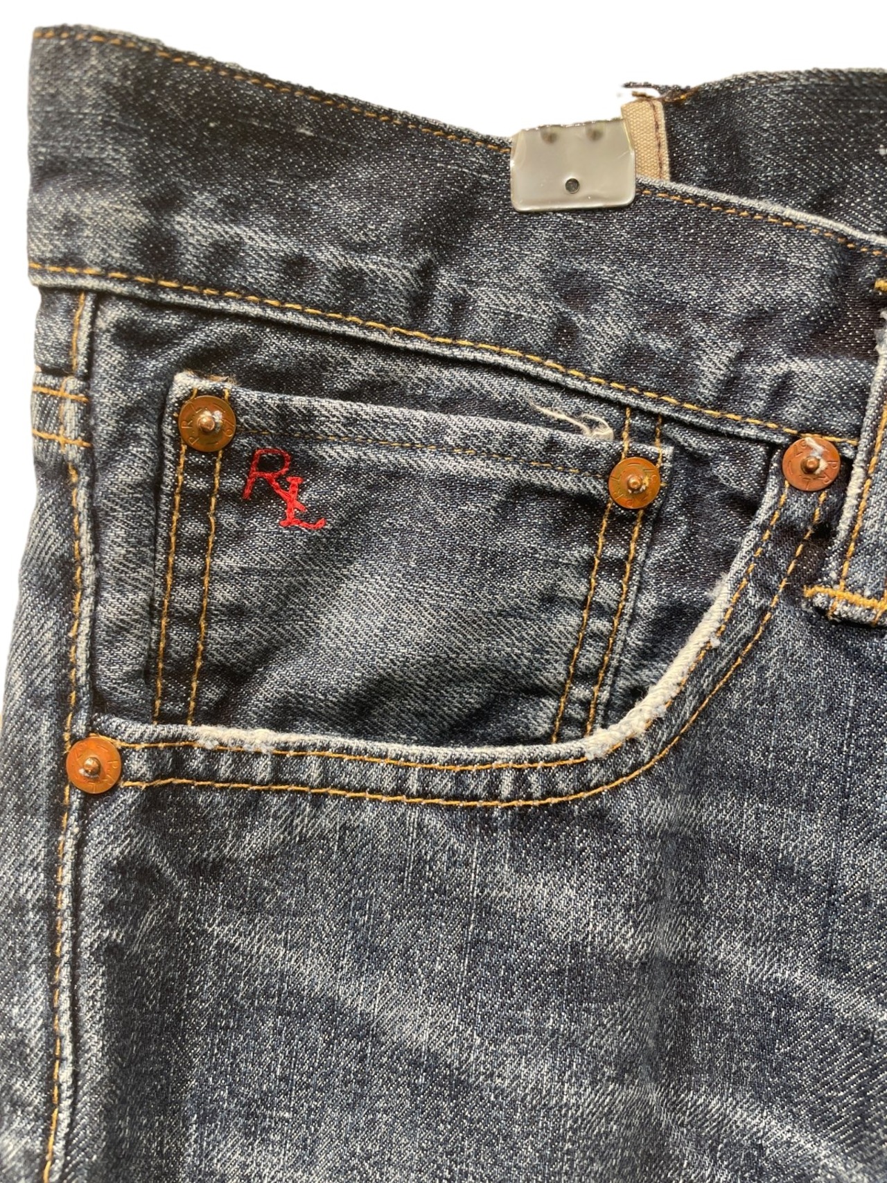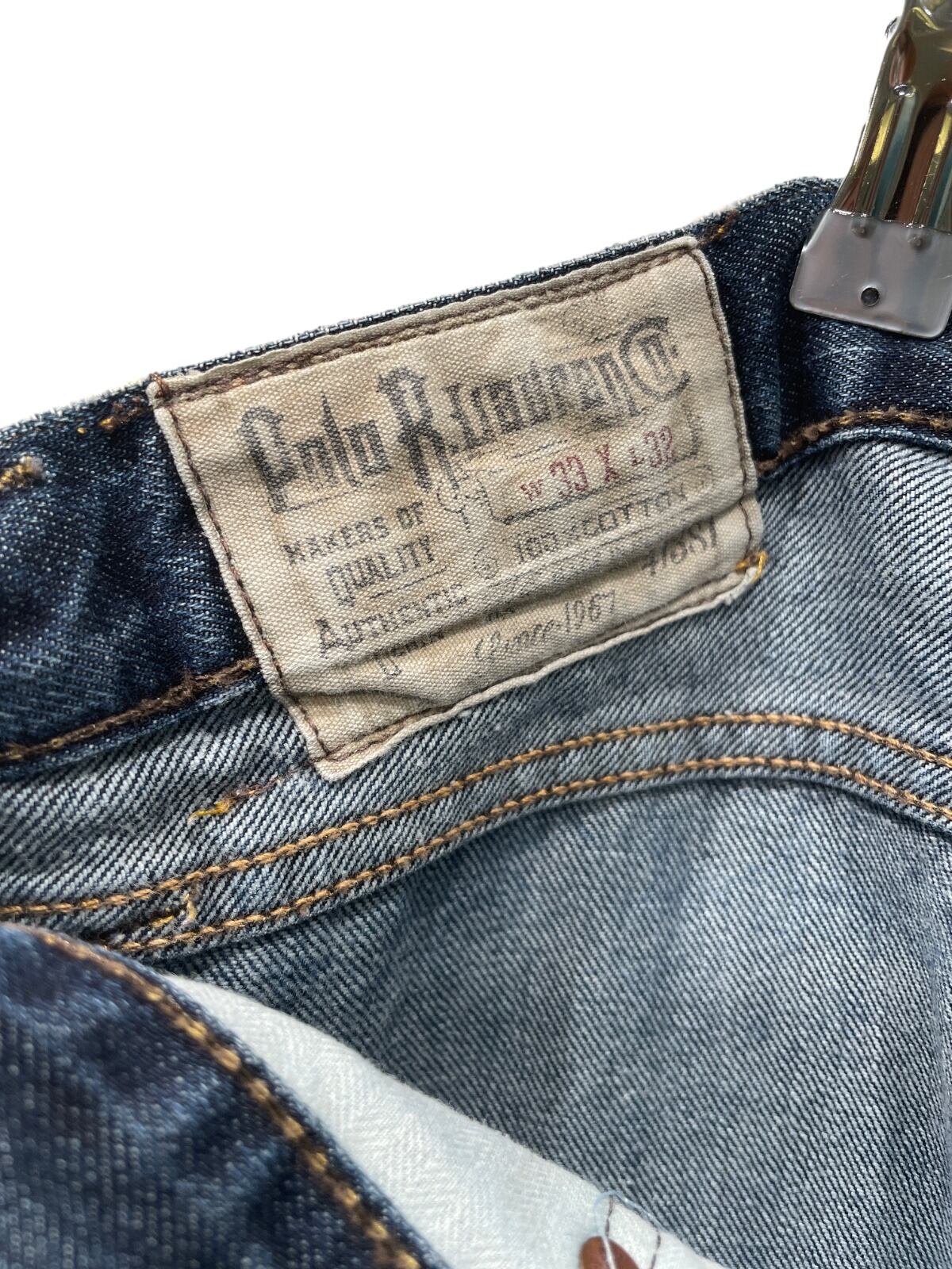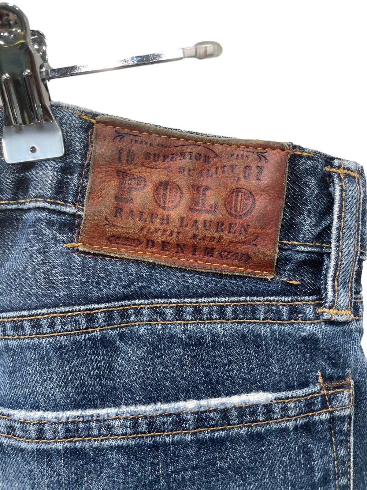 ジッパーフライ、打ち込みのリベット、革パッチ、コインポケットの赤RL刺繍などブランドディテールが揃う一方、裾はカットオフ気味でほつれが出ておりロールアップで表情を変えやすい。