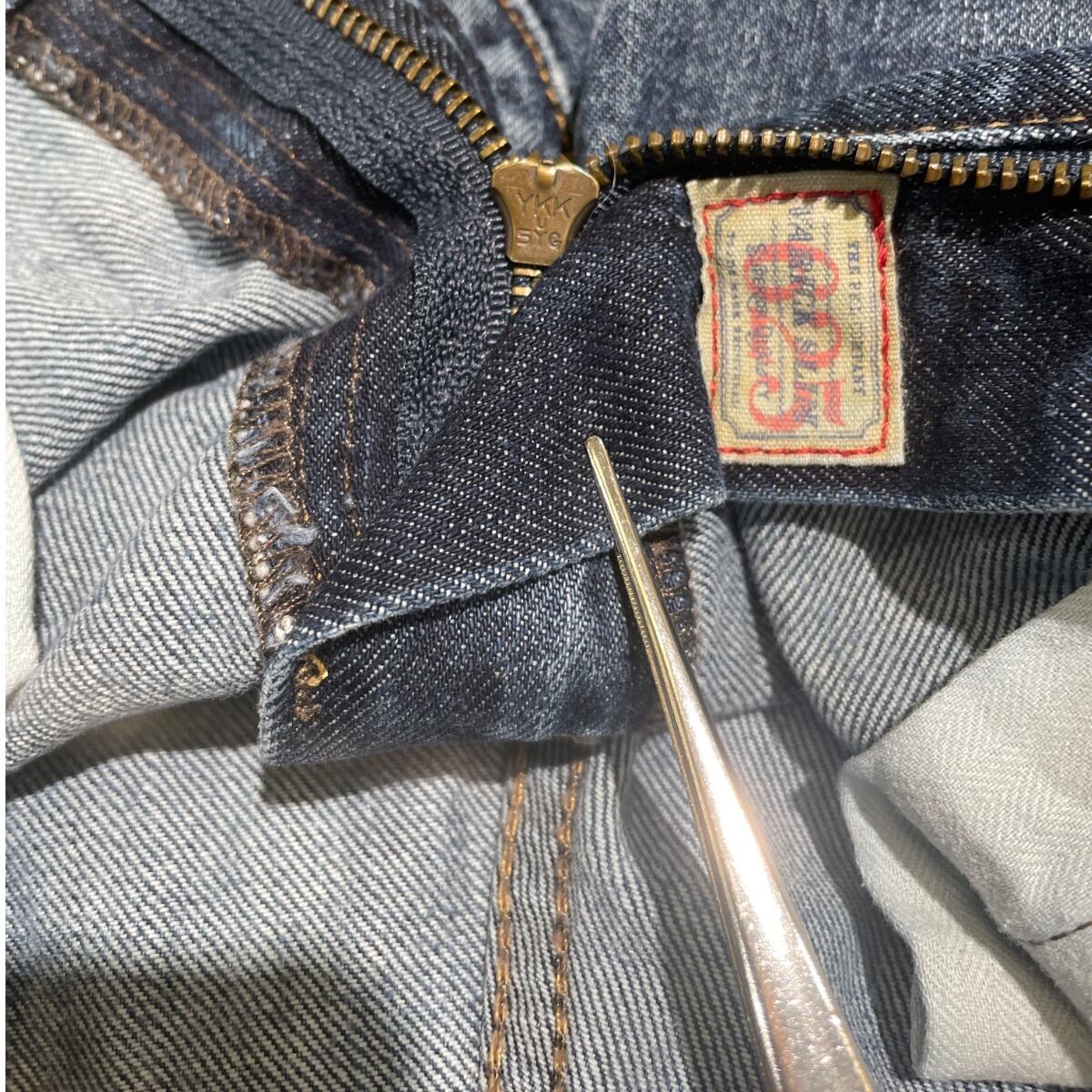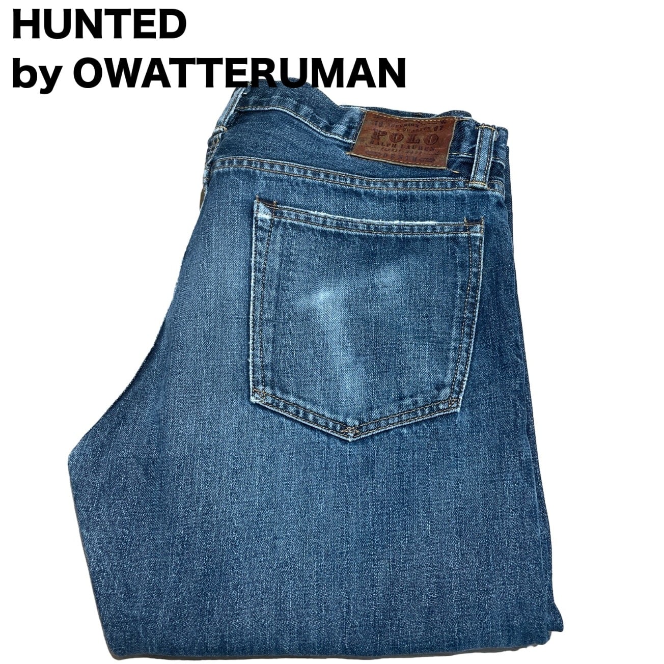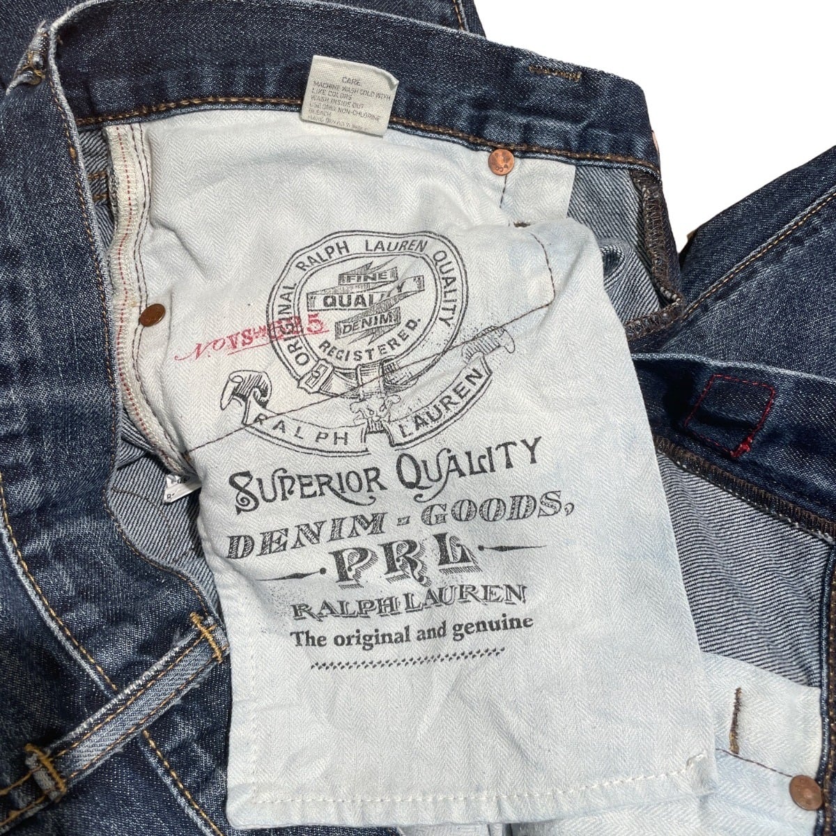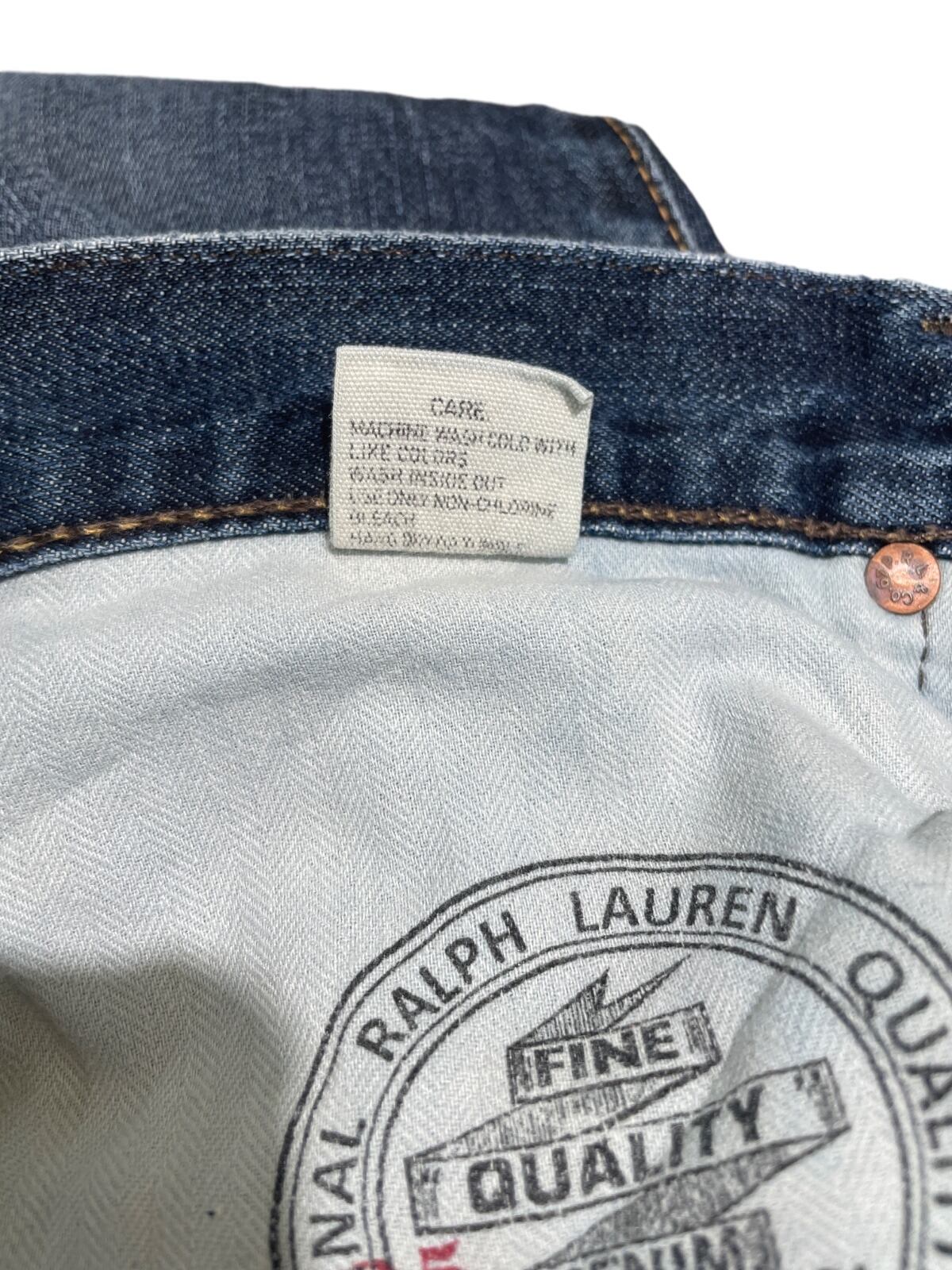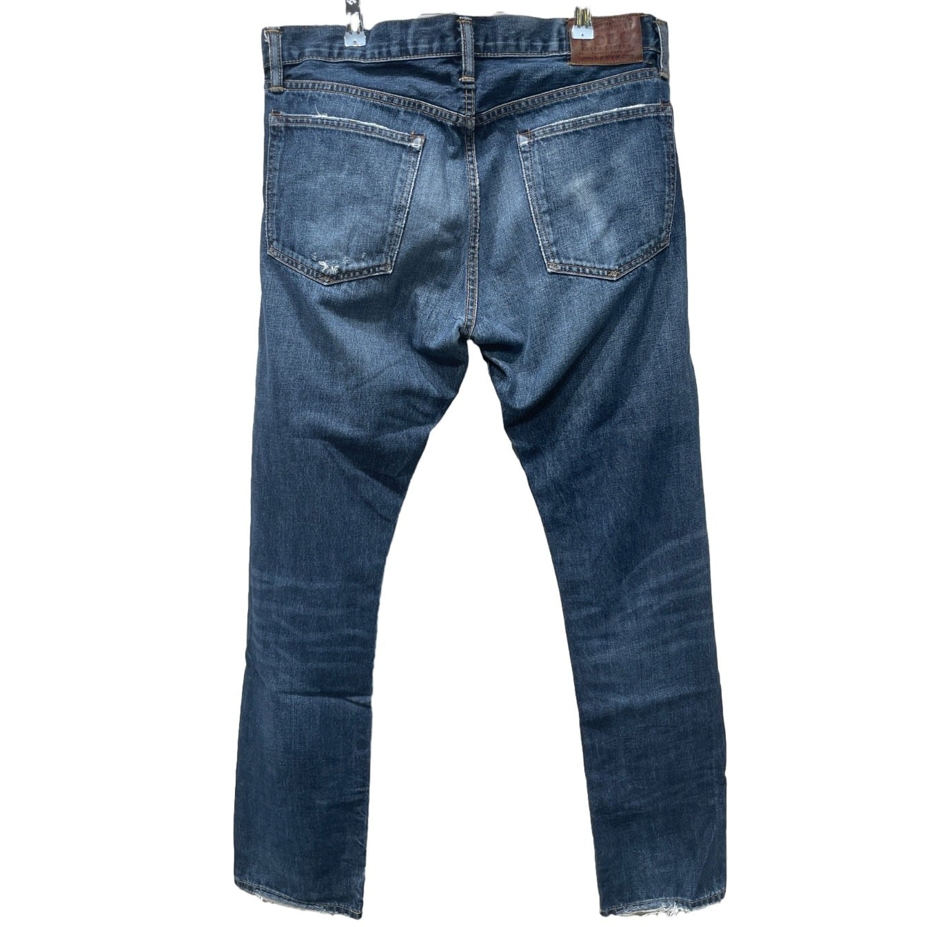 ジッパーフライ、打ち込みのリベット、革パッチ、コインポケットの赤RL刺繍などブランドディテールが揃う一方、裾はカットオフ気味でほつれが出ておりロールアップで表情を変えやすい。