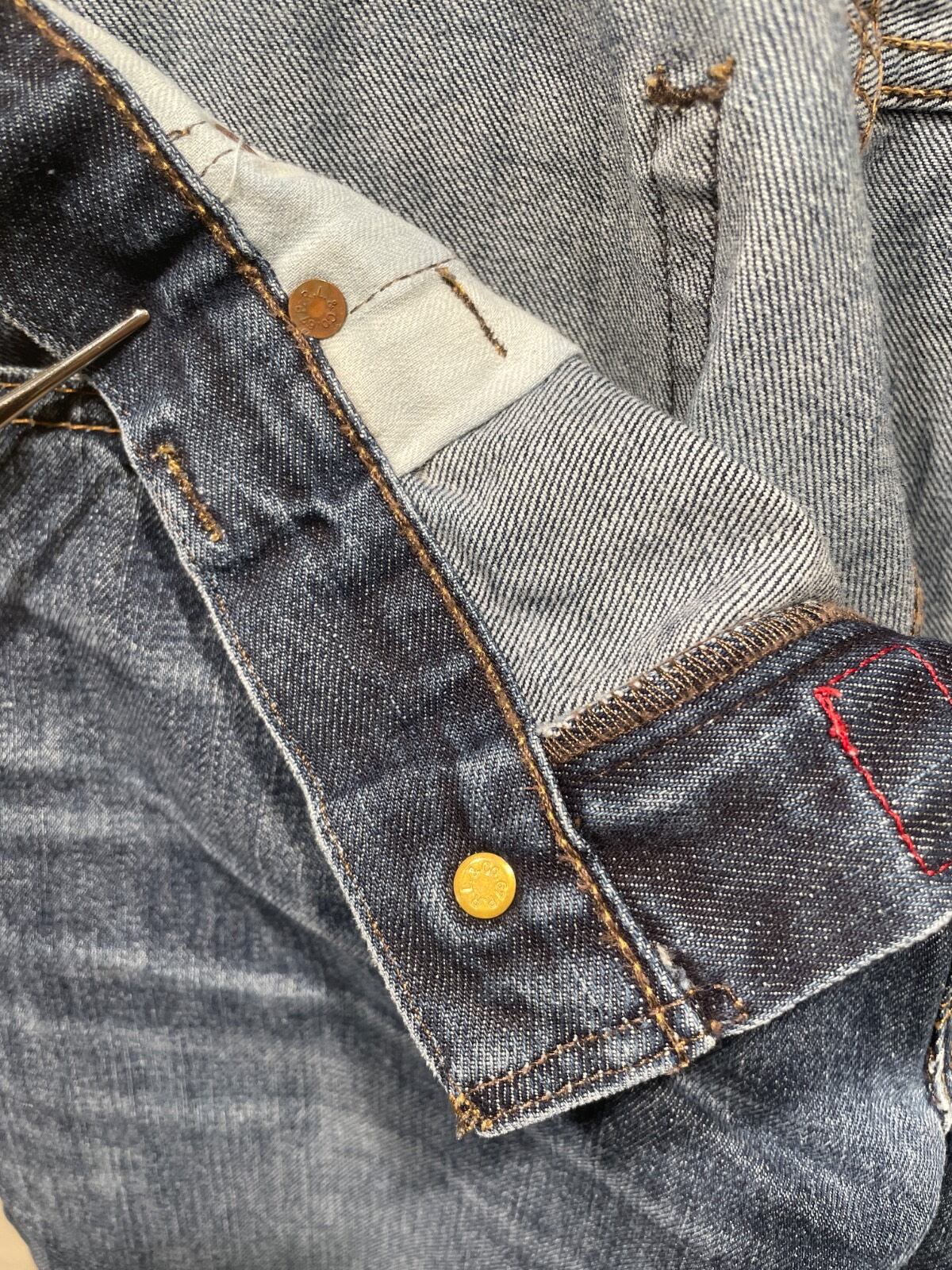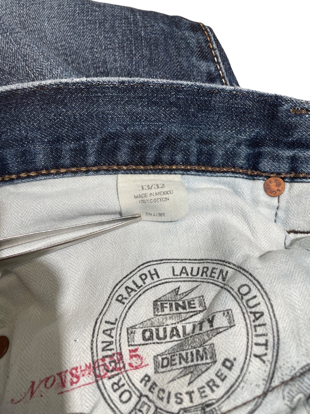 今回の個体は内ポケットの大判プリントロゴ、革パッチ、コインポケットの赤刺繍などブランドのデニムラインらしい意匠を備え、タグのサイズ表記とMade in Mexicoの生産国表記から00s頃のラインで作られたモデルと推定される。