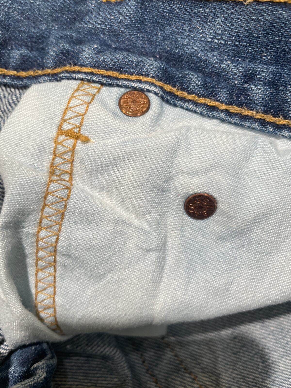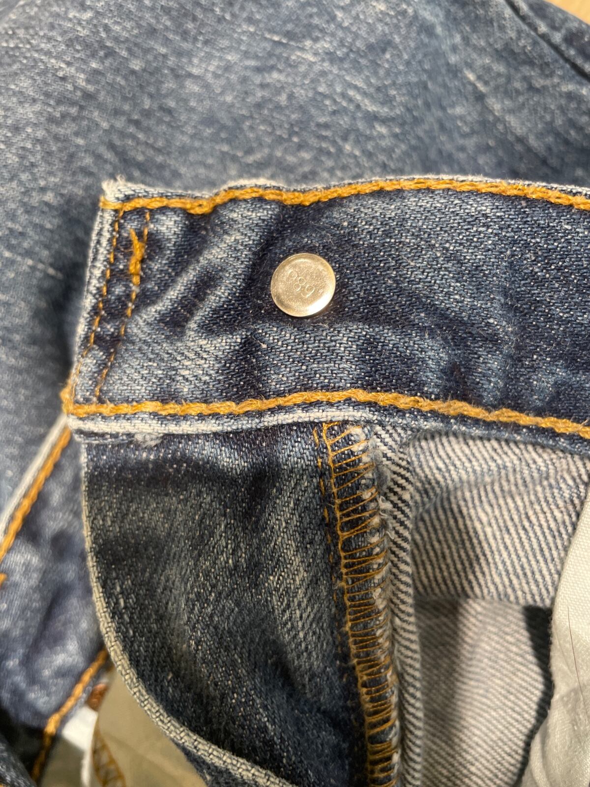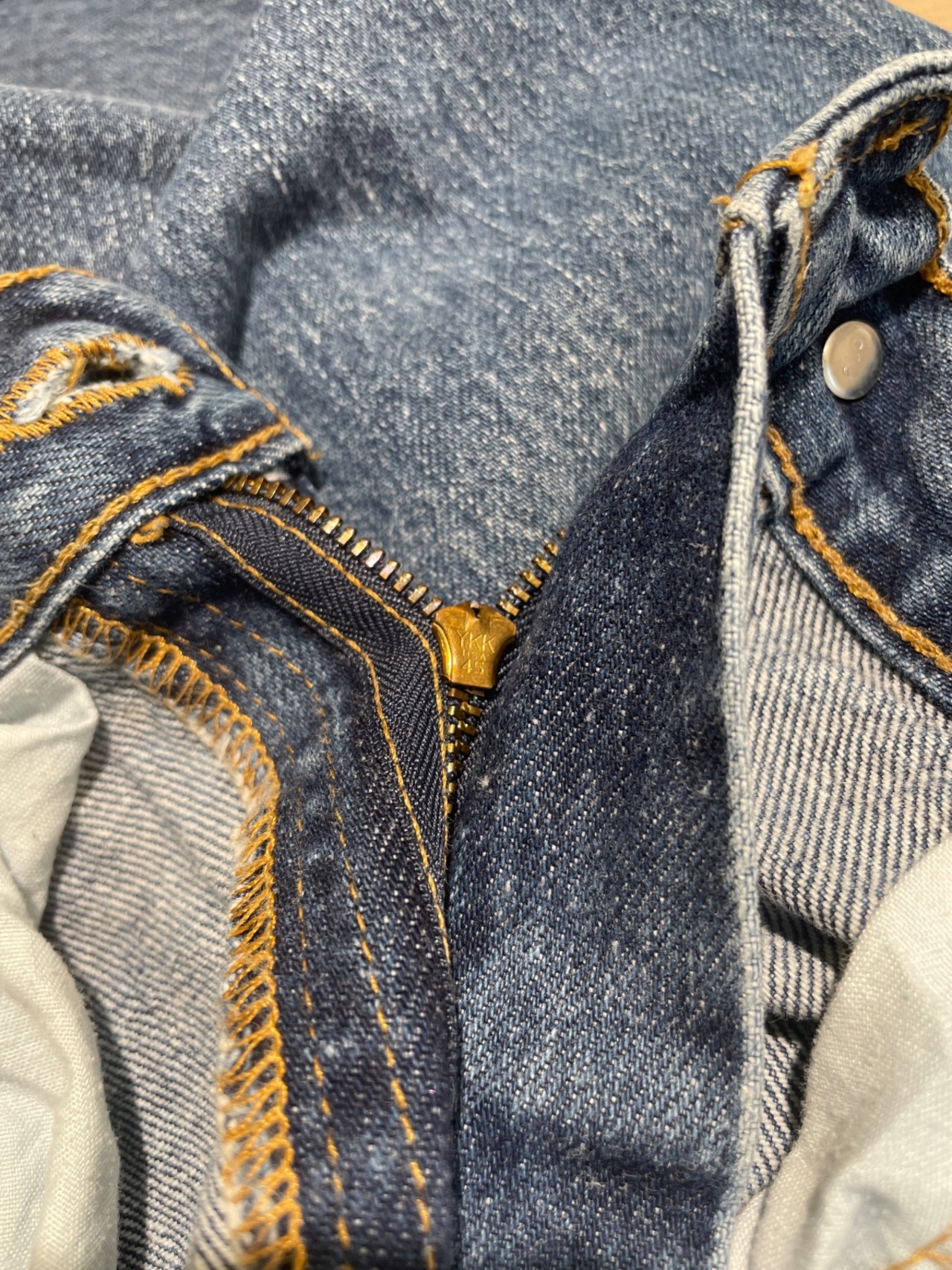 ジッパーフライ(Levi's刻印あり)仕様で着脱はスムーズ。膝下に複数の小さなダメージとペイント飛びが見られ、着込まれた表情が出ている点も特徴です。