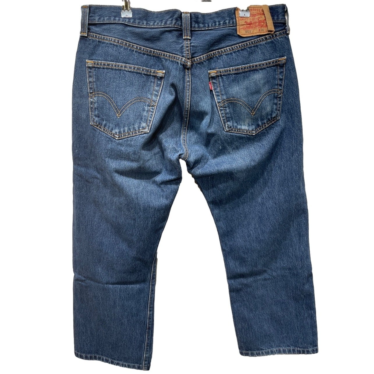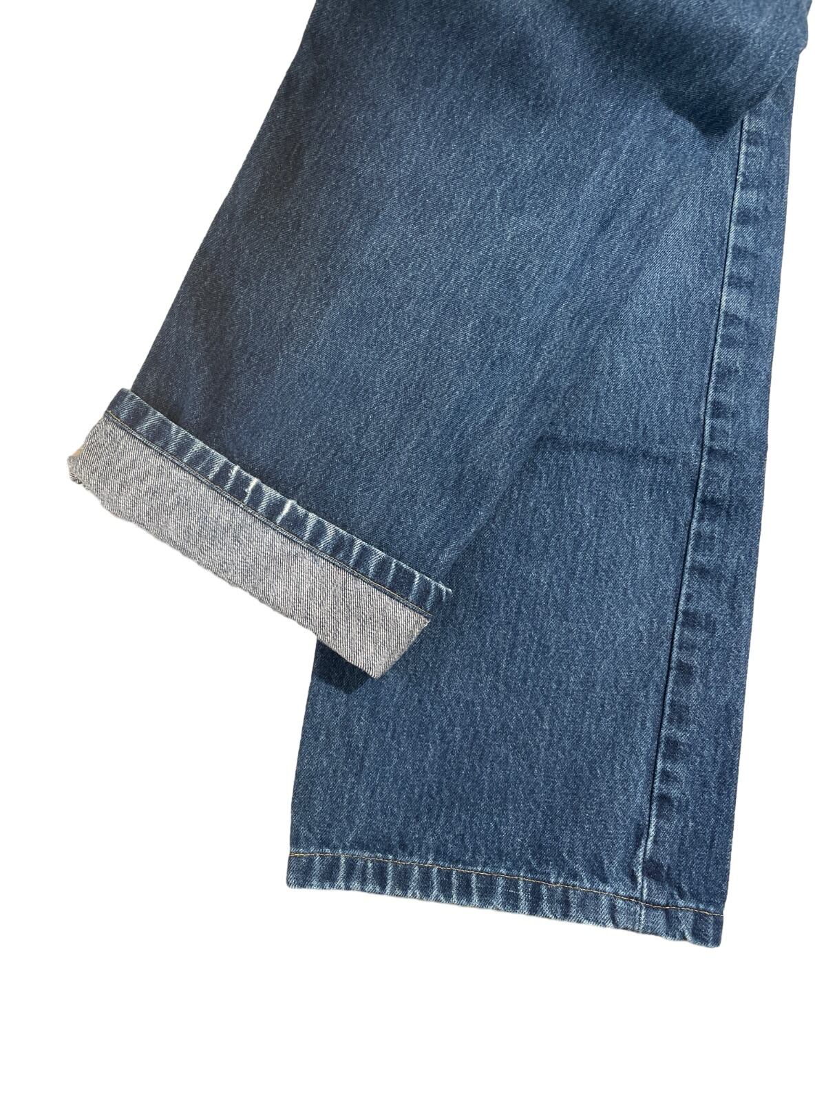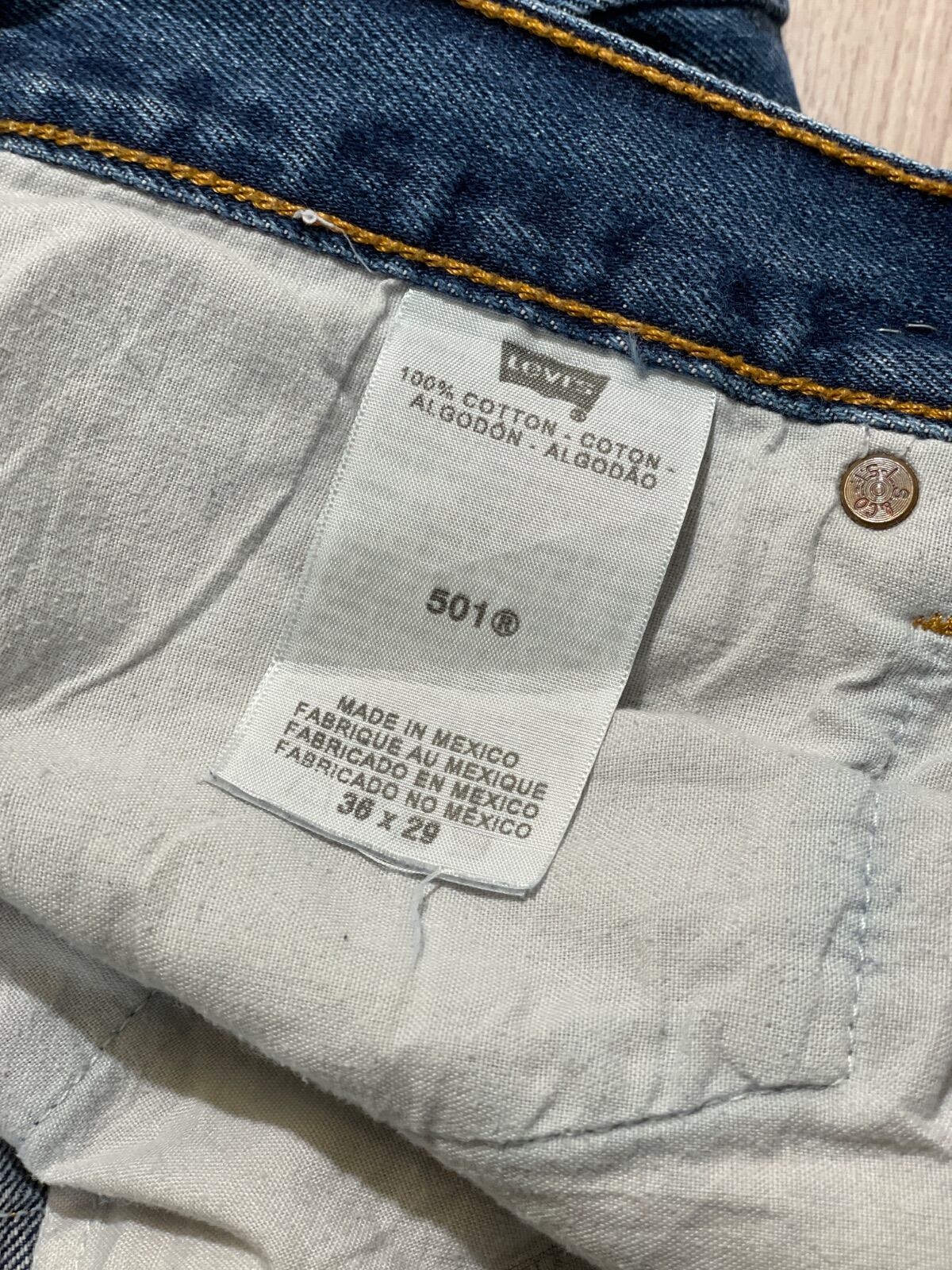 この個体はボタンフライとMade in Mexico表記を備え、日常的に穿かれて付いた自然な色落ちと小さなダメージが良い空気感を出している。