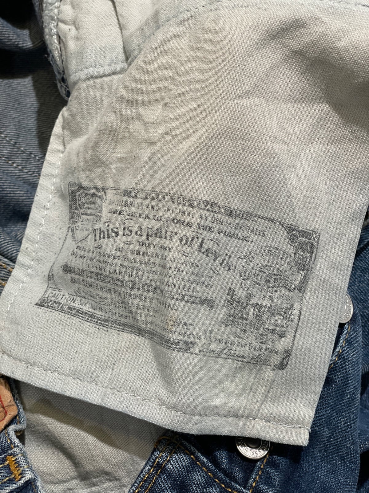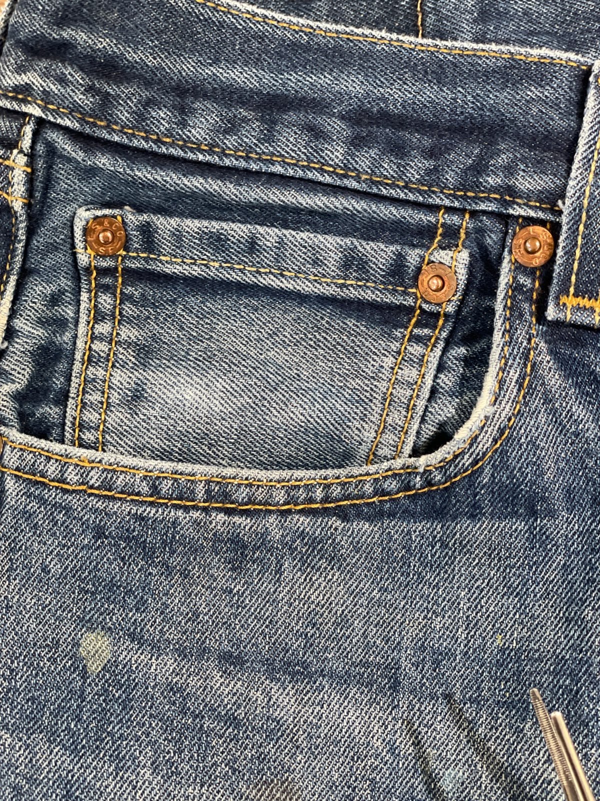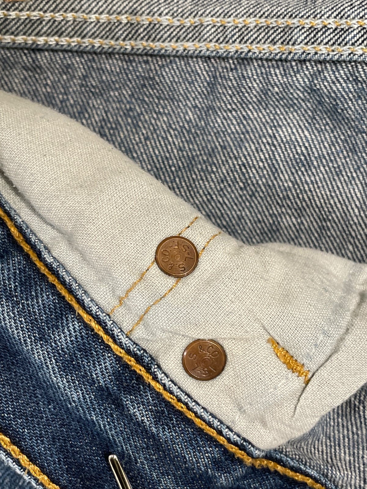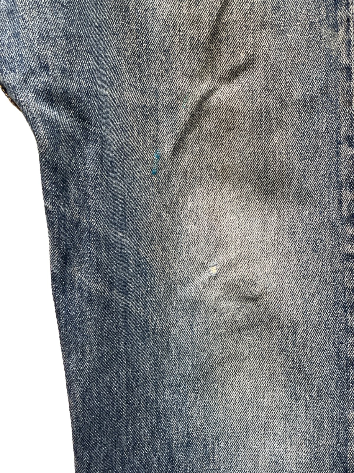 ボタンフライと経年の色落ちが顔周りを引き立て、ペイント跡や部分的なダメージがワークテイストを強めています。
