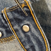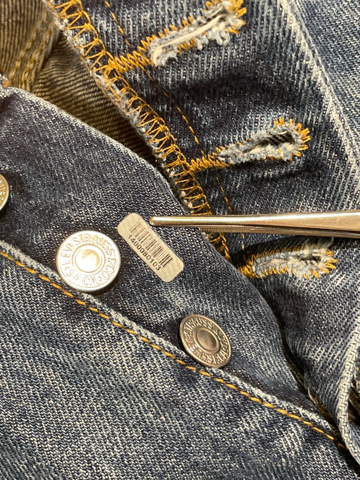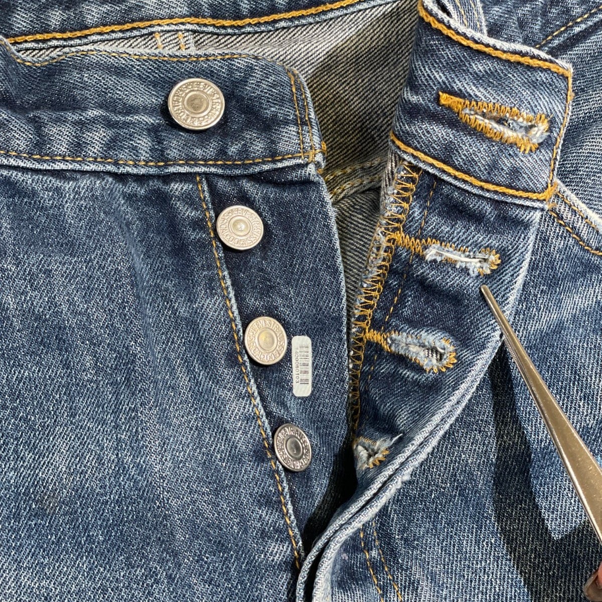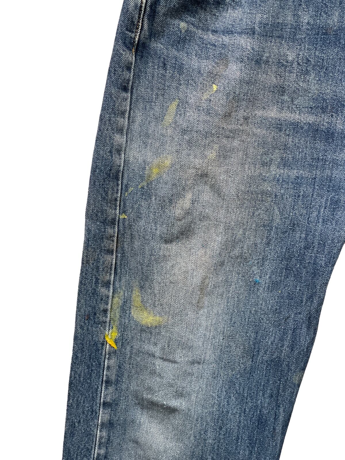 ボタンフライと経年の色落ちが顔周りを引き立て、ペイント跡や部分的なダメージがワークテイストを強めています。