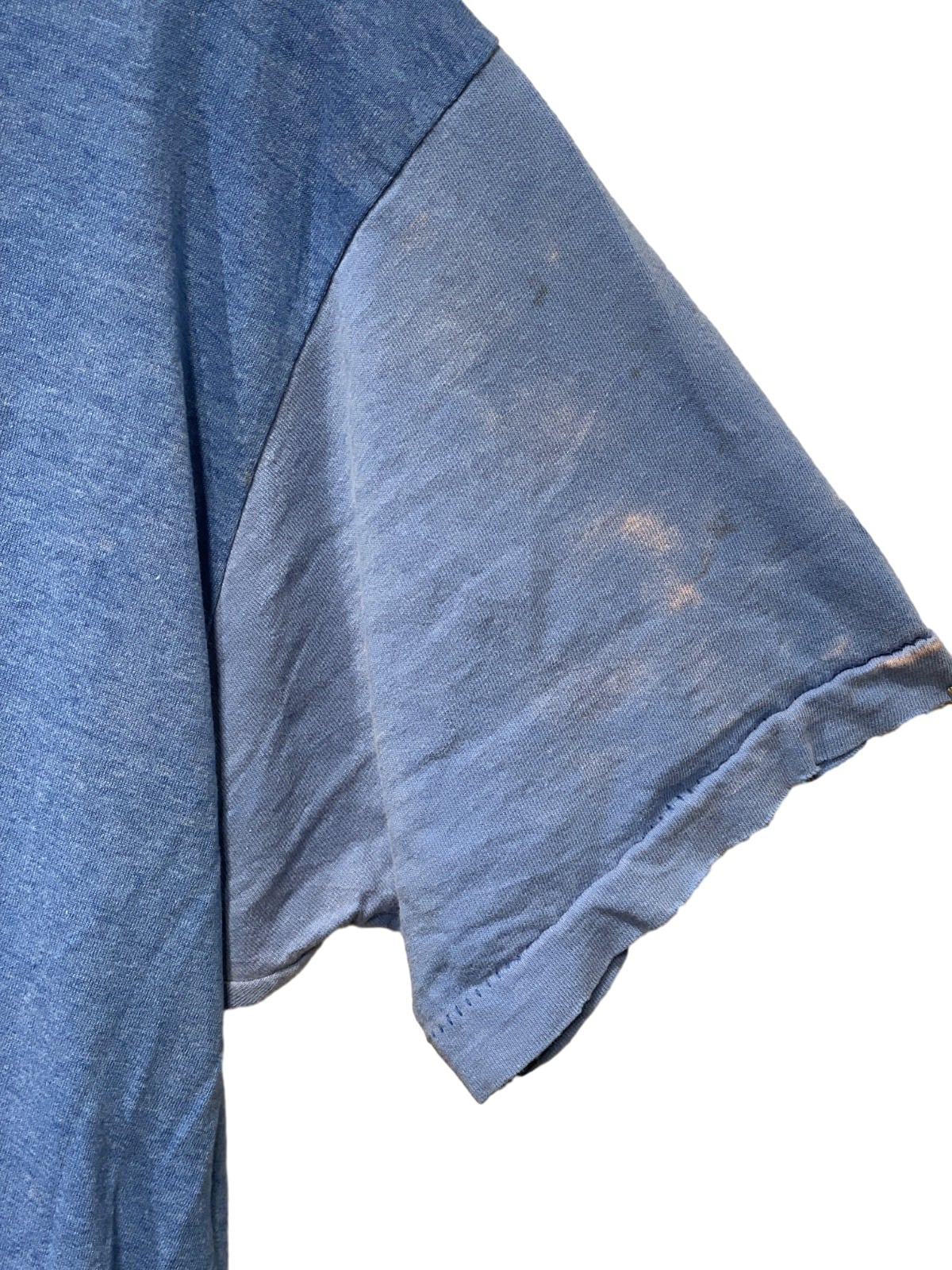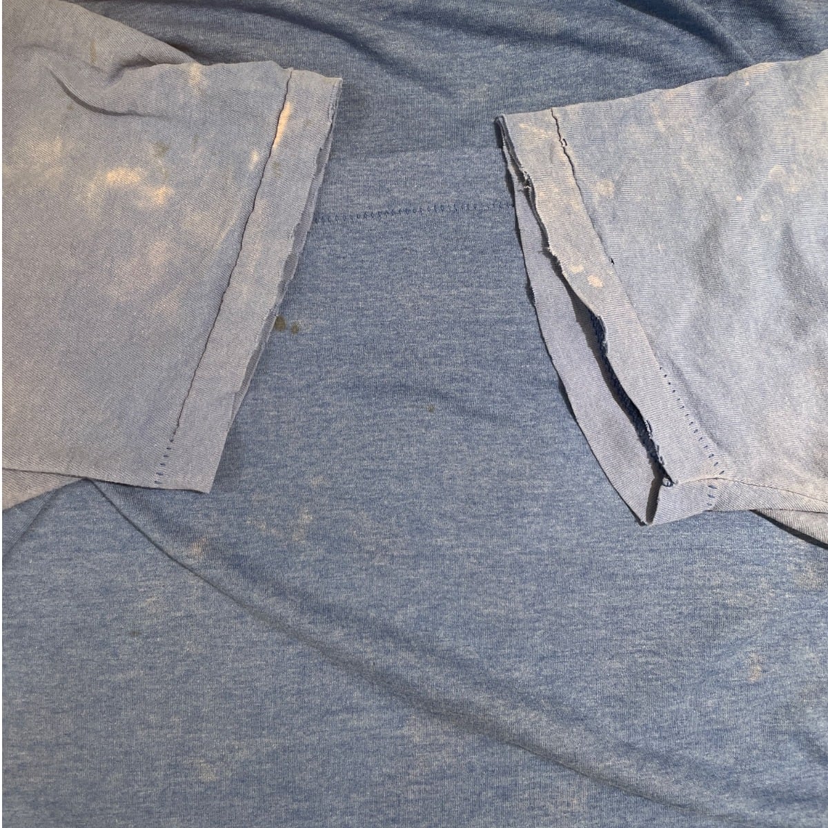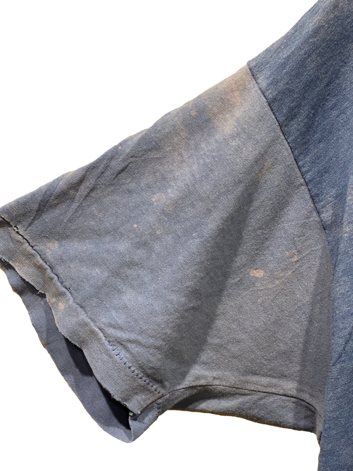 袖口や裾にほつれや小穴があり、ボディに点状の汚れ(ペンキ状のシミ)が複数見られるためワークユースの使用感が強い。