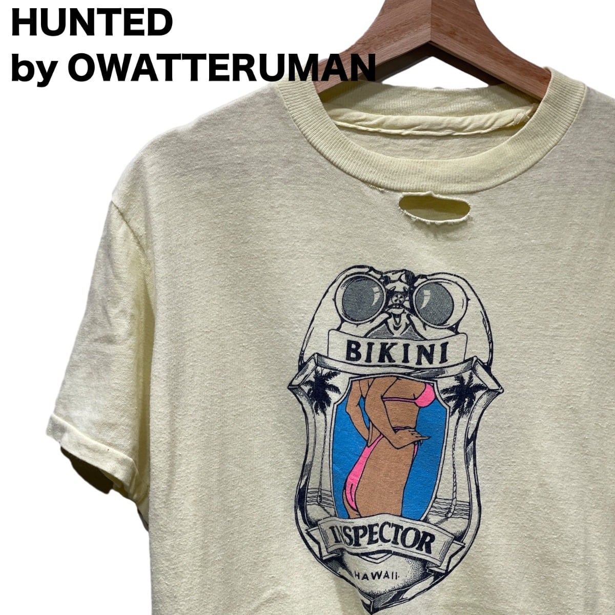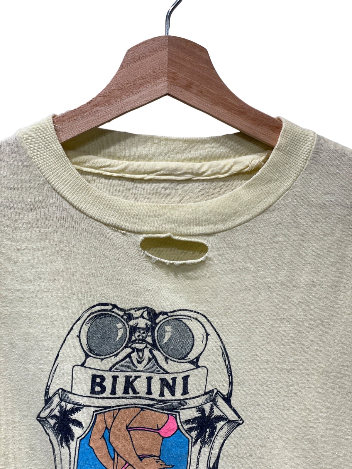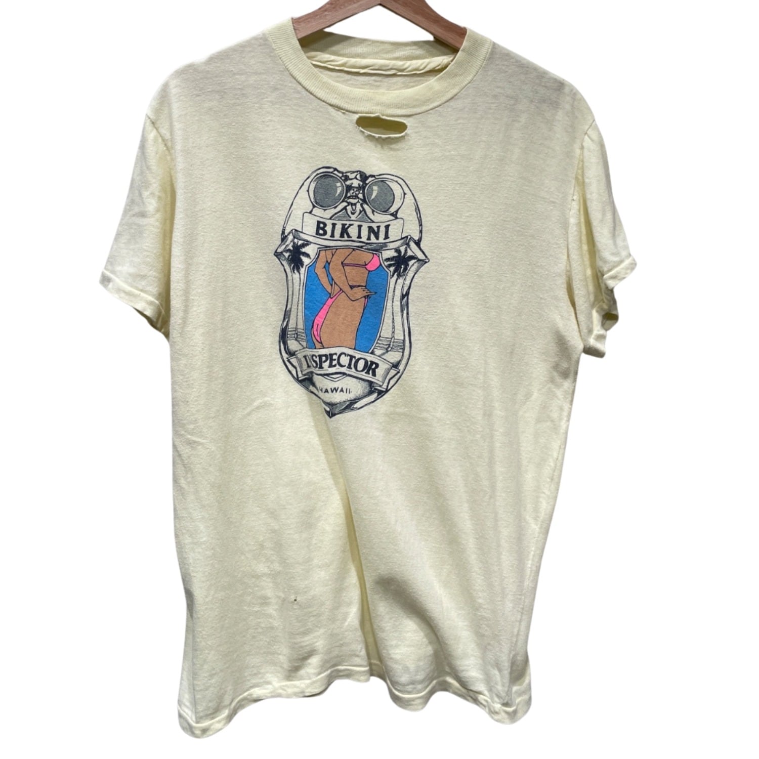 胸元の"BIKINI INSPECTOR HAWAII"プリントはビーチやサーフ系の土産物Tシャツに見られるデザインモチーフです。