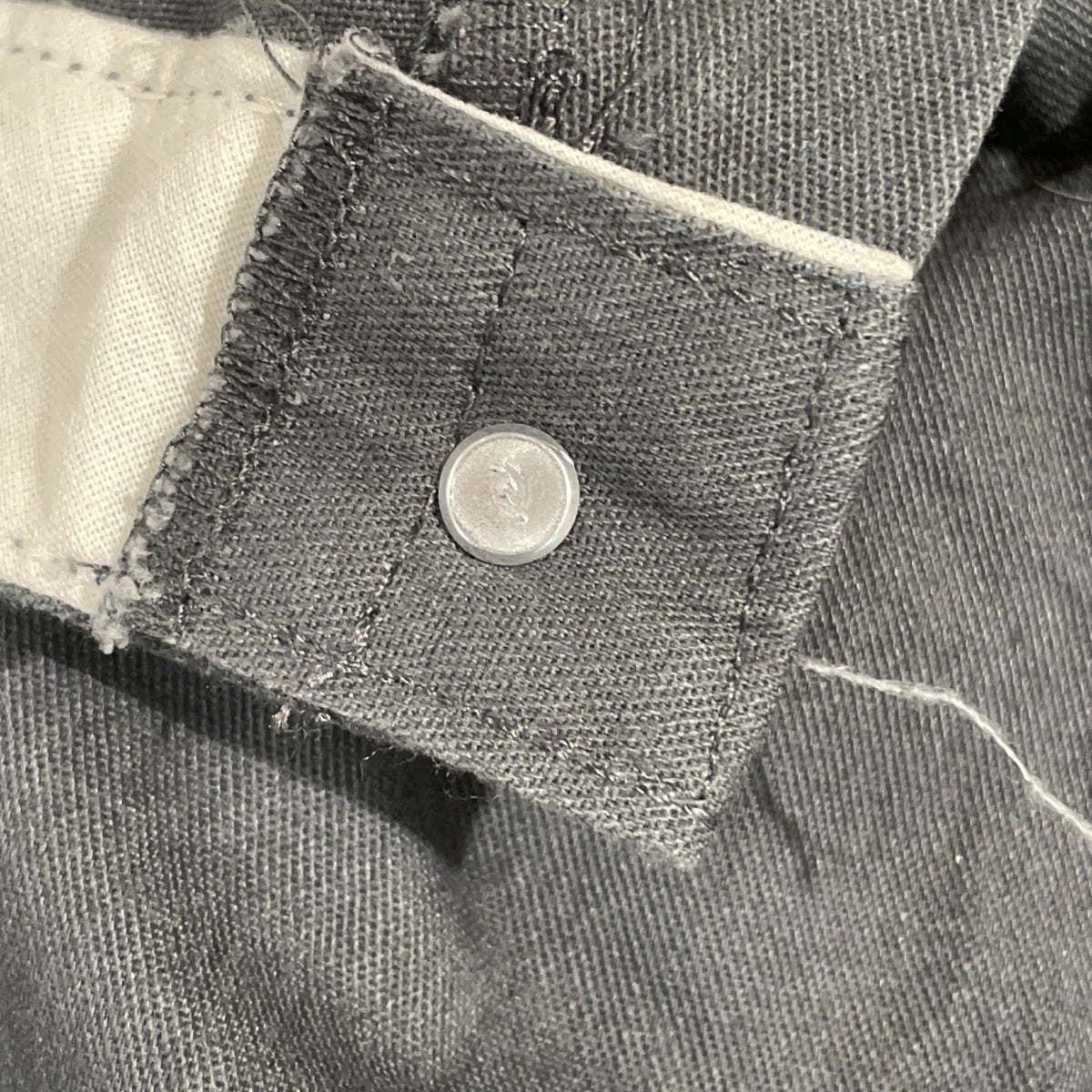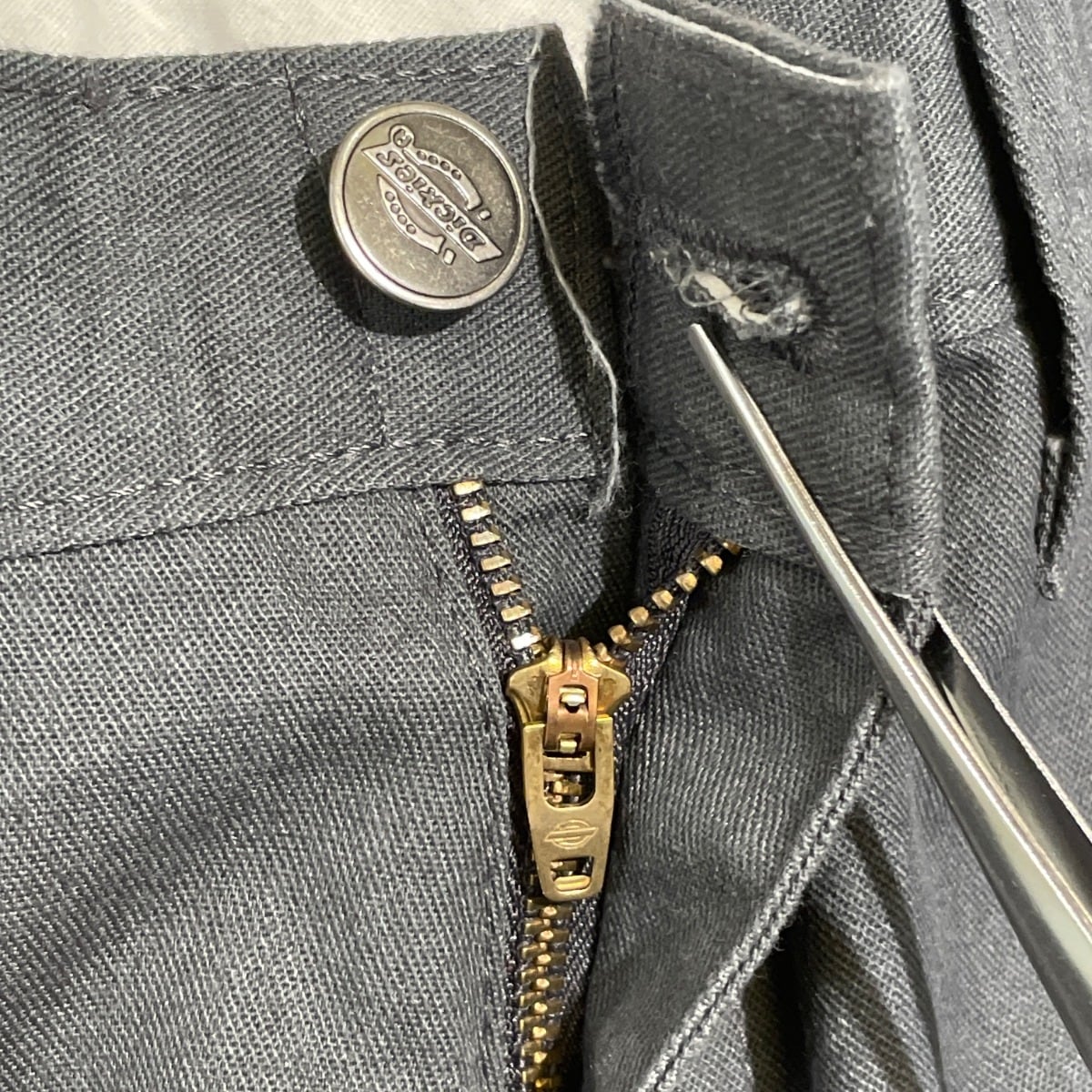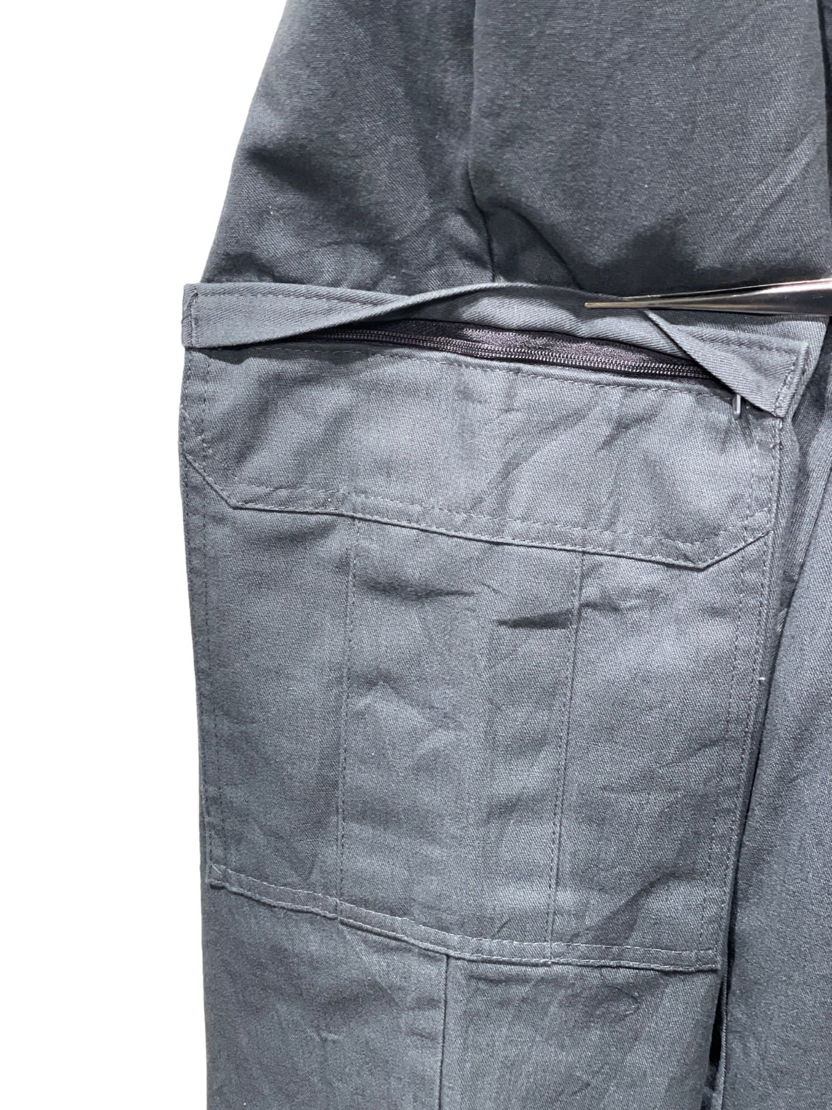 サイドのカーゴポケットと実用的なディテール(ブランド刻印ボタン、YKKジッパー)を備えたワーク仕様。