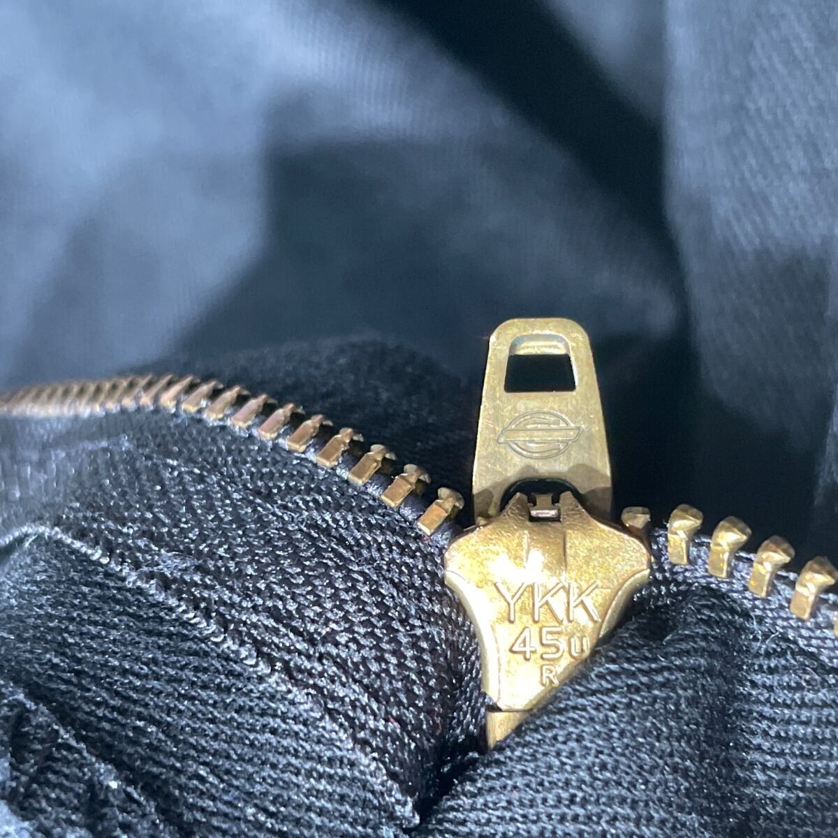YKKジップやウェルトのバックポケット、右バックに小さなロゴパッチといった実用的なディテールを備える。