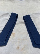 ネイビーのリンガーネックと胸~胴に入る切替パネルがスポーティで視覚的なアクセントになっている。
