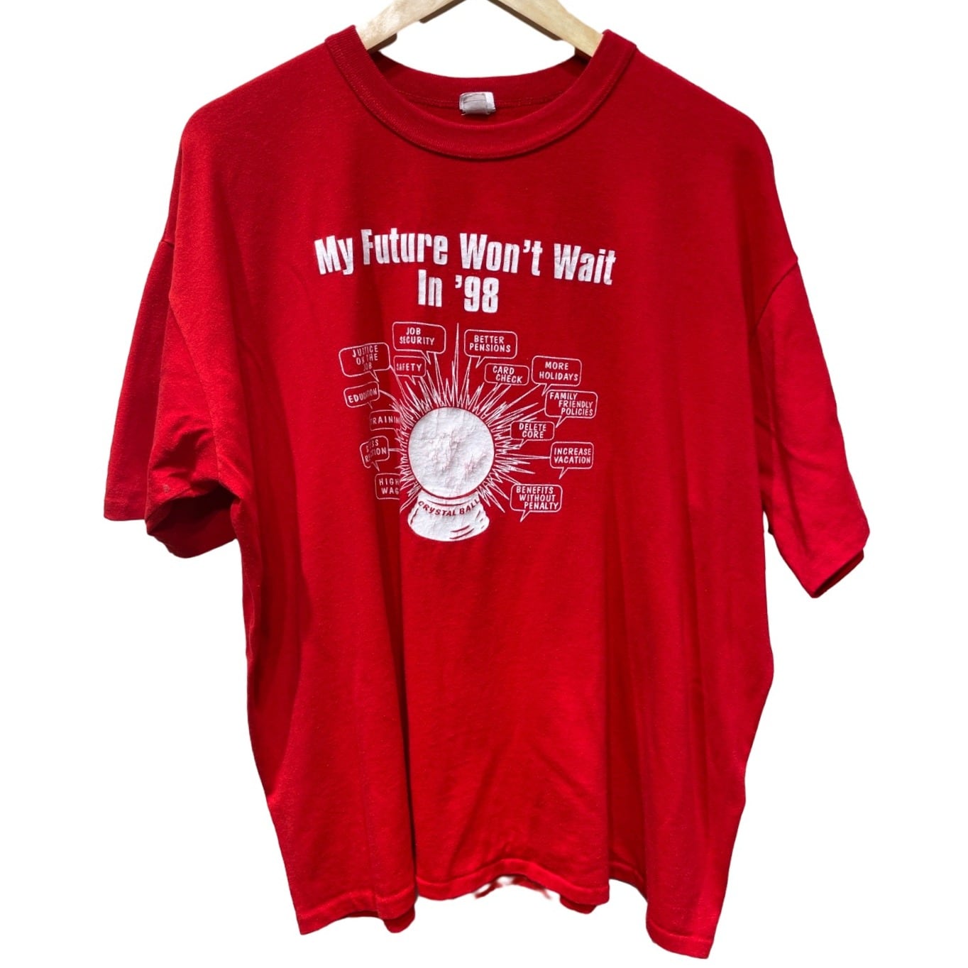 フロントの「My Future Won't Wait In '98」というメッセージとバックのCWA Local 2108クレストが組合の訴求を示すアイテム。