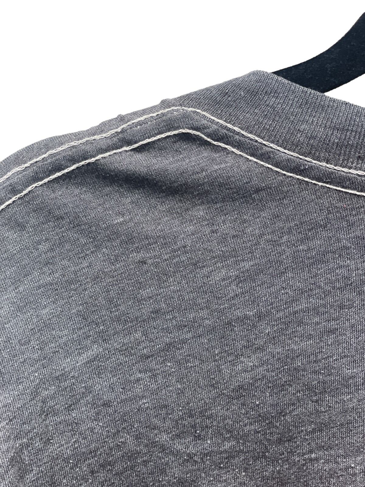 肩に入るダブルステッチの縫製と細めのリブネックが確認できる仕様です。