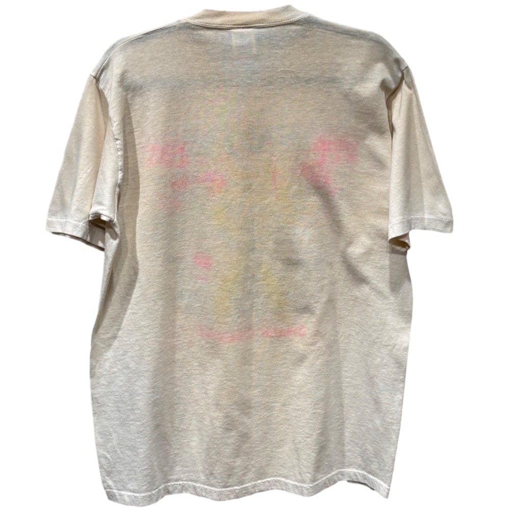 経年によるプリントの色褪せとともに、背面や袖にピンクの色移りが複数見られる点がコンディションの特徴。