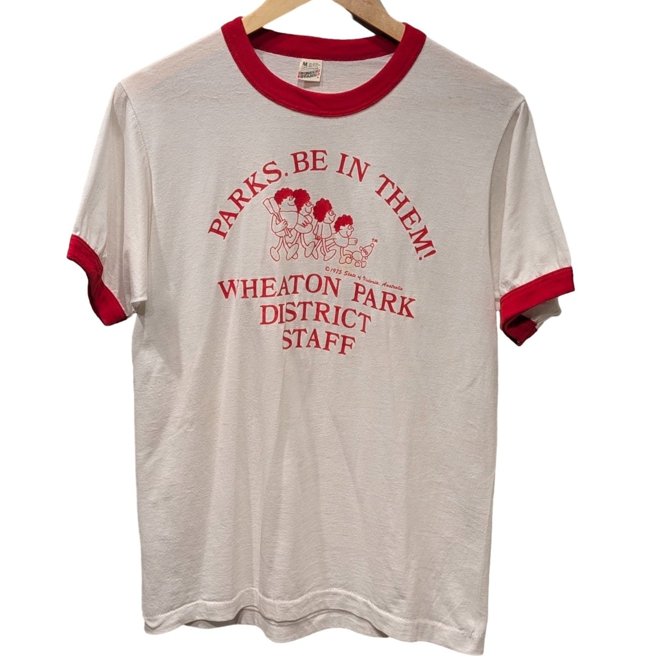 "PARKS. BE IN THEM!"や"WHEATON PARK DISTRICT STAFF"のプリントはコミュニティ向けの実用的なグラフィックをそのまま残している。