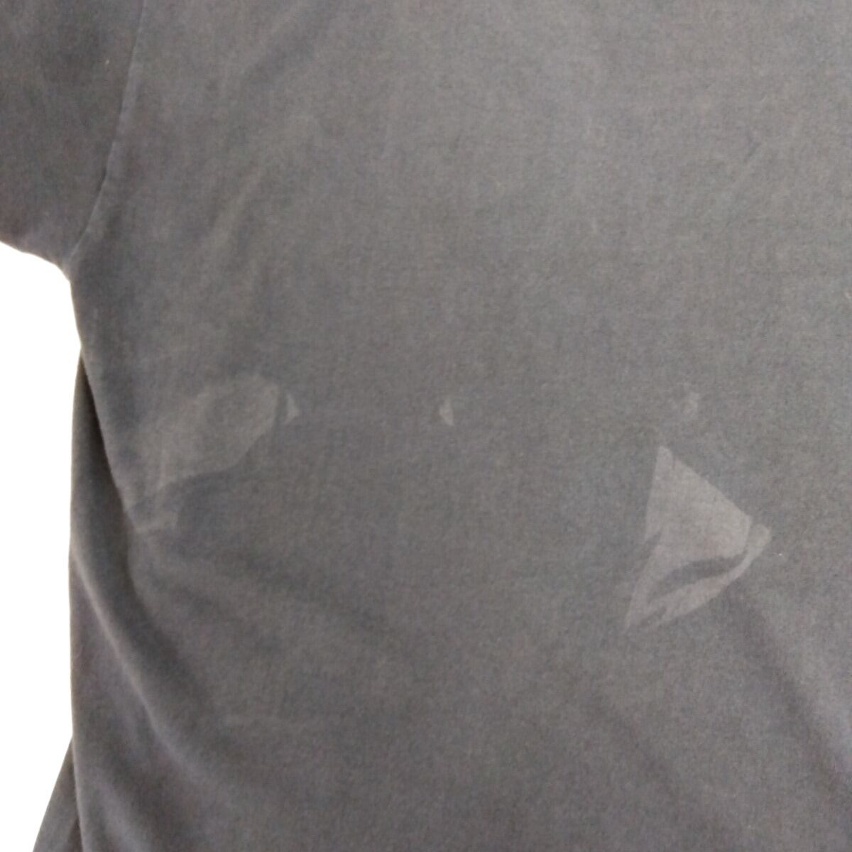 両脇下に破れ、前面裾と首元下、背中に汚れがあるためリペアや洗いでの処理を前提にしたコンディションである。
