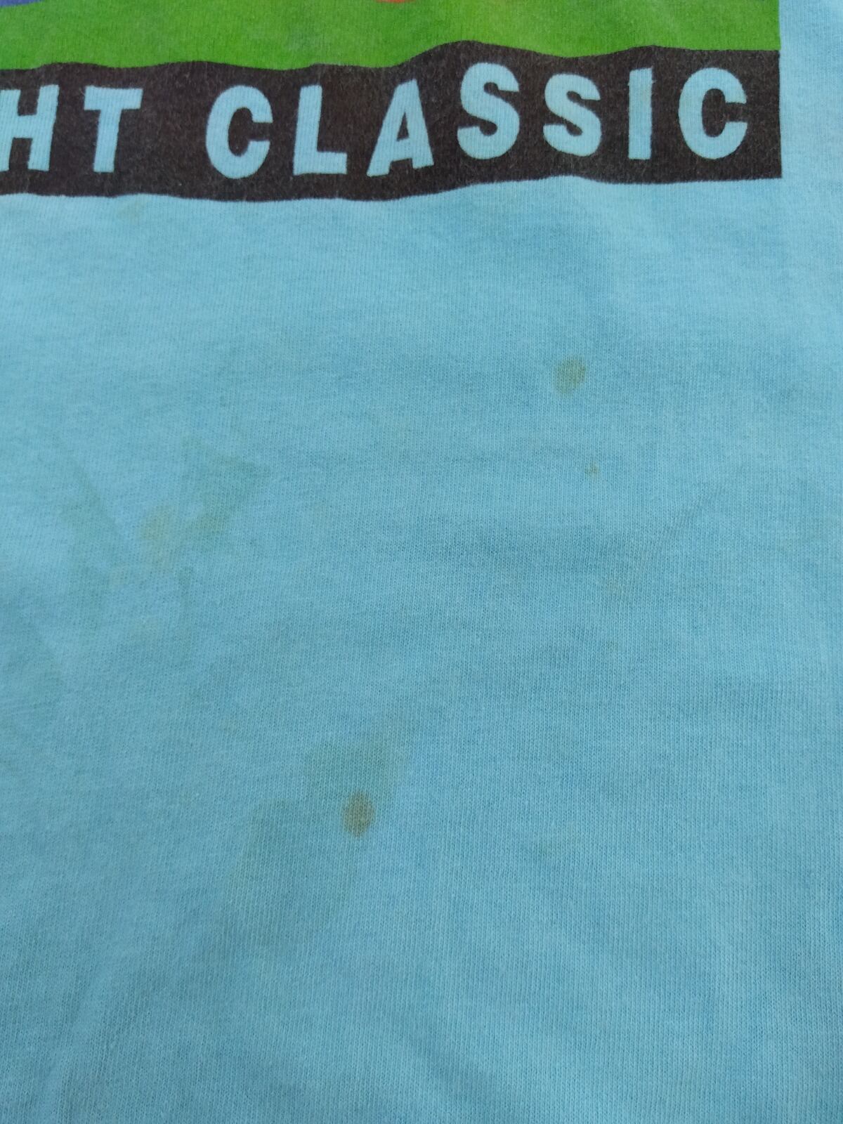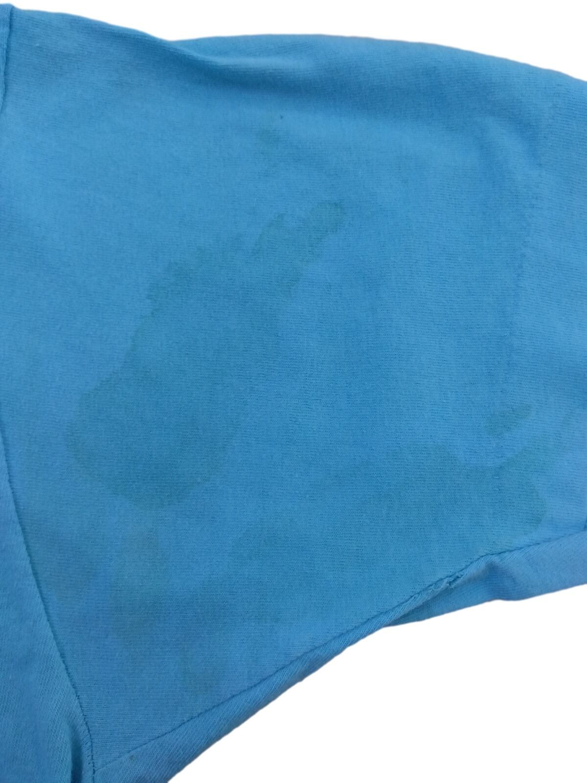 背面のRocky's Pizzeriaプリントから、地場のスポンサーやローカルイベント配布のワークシャツ的な背景がうかがえる。