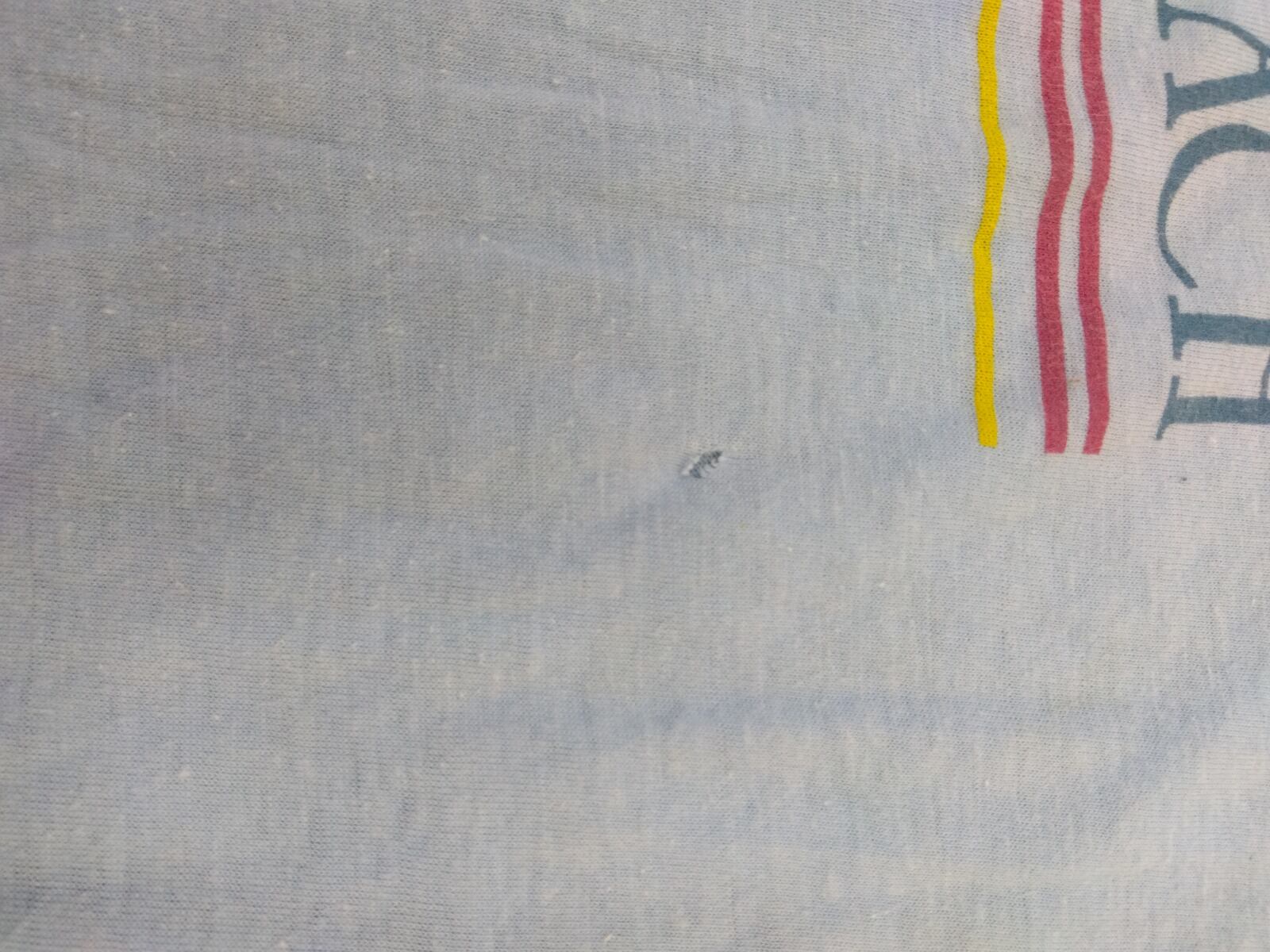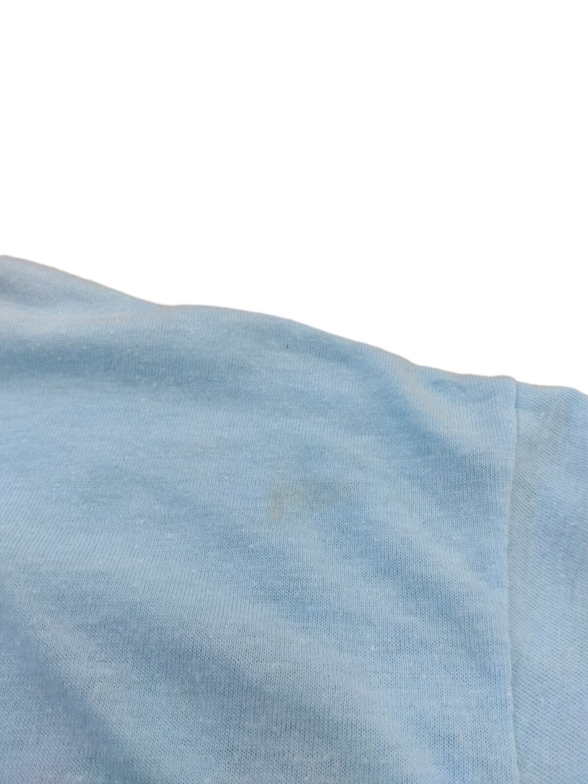 プリントはフェードと若干のクラックがあり、前面左肩のシミ、ロゴ左下の小穴、腹部の汚れ、背中左側のやぶれ、右袖のほつれなど経年ダメージが見られる現状品。