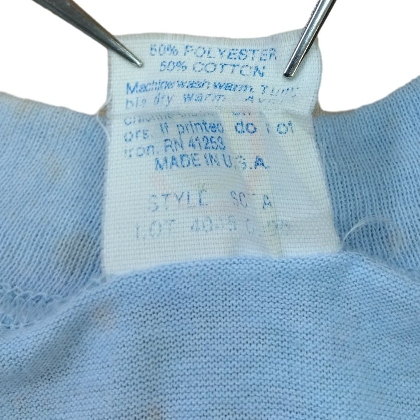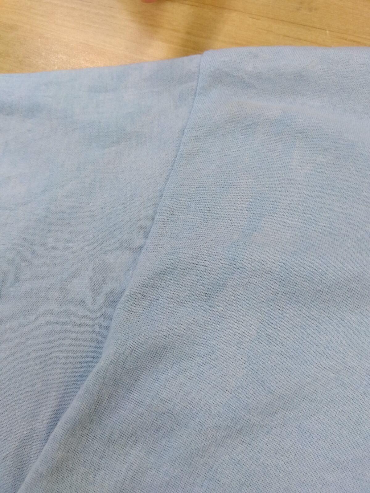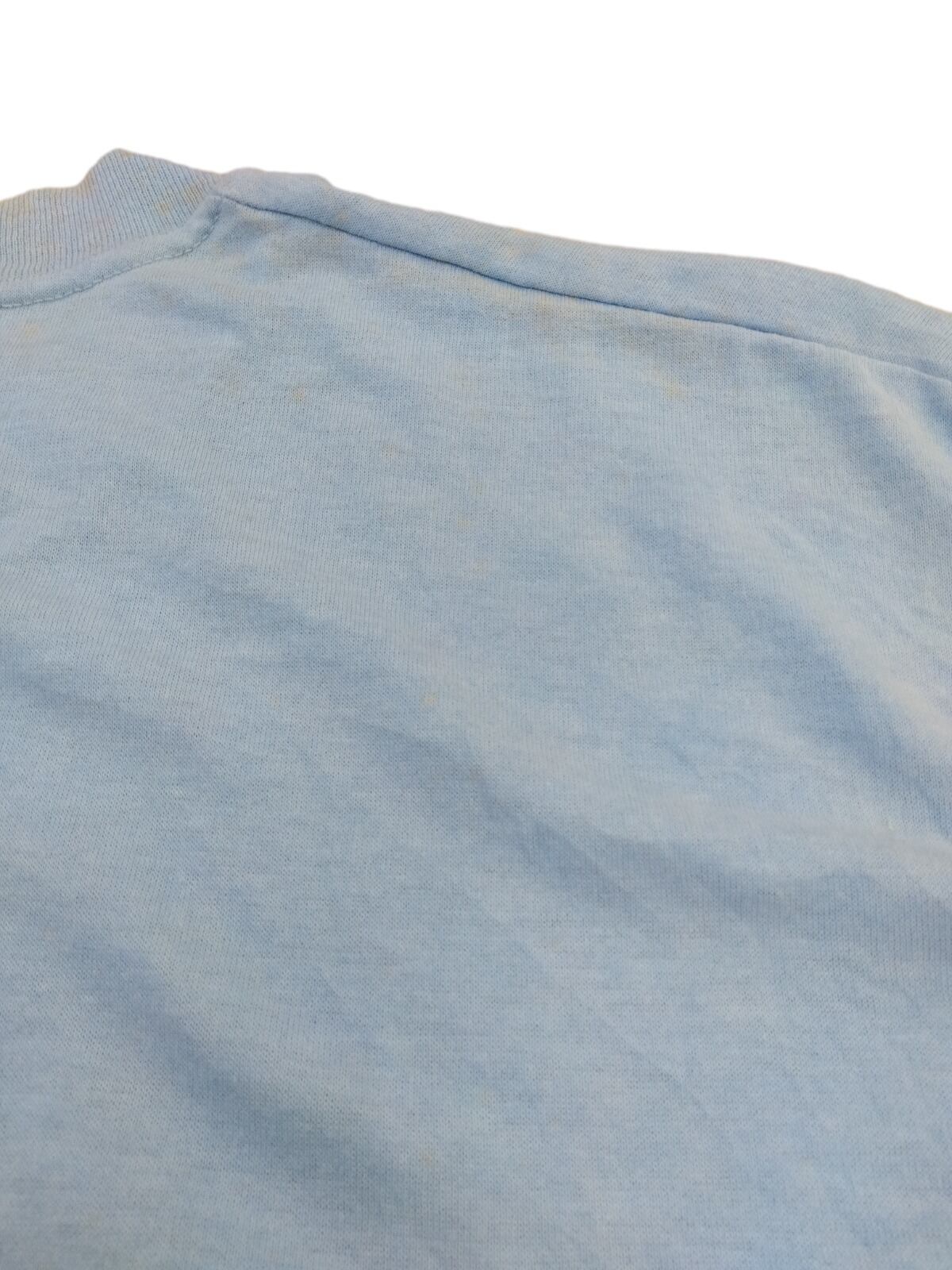 首元はリブ付きのクルーネックで、使用感による色褪せと全体的な汚れ、背面首元に2箇所の小さな穴がある点に注意。